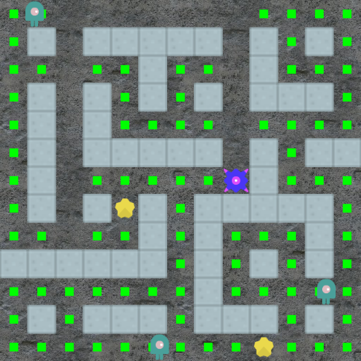 该游戏灵感源自Atari游戏《MsPacman》。关卡布局采用Kruskal算法生成,随后逐步移除墙壁,直至洞穴中不再存在死胡同。玩家需收集所有绿色的球状物。当玩家收集到3颗大型星星时,这些星星会在短时间内使敌人变得脆弱。若与未处于脆弱状态的敌人发生碰撞,玩家将被击败。当敌人的生命值被消耗至一定程度时,地图上会生成一颗蛋,过一段时间后会孵化成新的敌人,从而保持敌人总数不变。玩家每收集一个球状物可获得少量奖励,而完成关卡则可获得丰厚奖励。 |