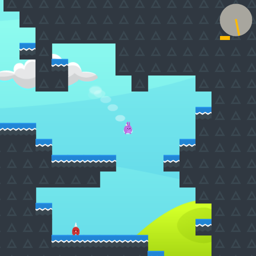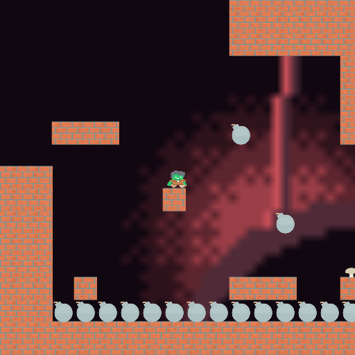 这是一款简单的平台跳跃游戏。玩家扮演一名忍者,需在狭窄的岩壁间跳跃,同时避开炸弹障碍物。玩家可从多个角度投掷飞星,以清除炸弹,必要时还可采取此策略。玩家的跳跃动作可在多个时间步中进行充能,从而增强跳跃效果。玩家在关卡终点收集到蘑菇后,即可获得奖励,游戏随即结束。 |