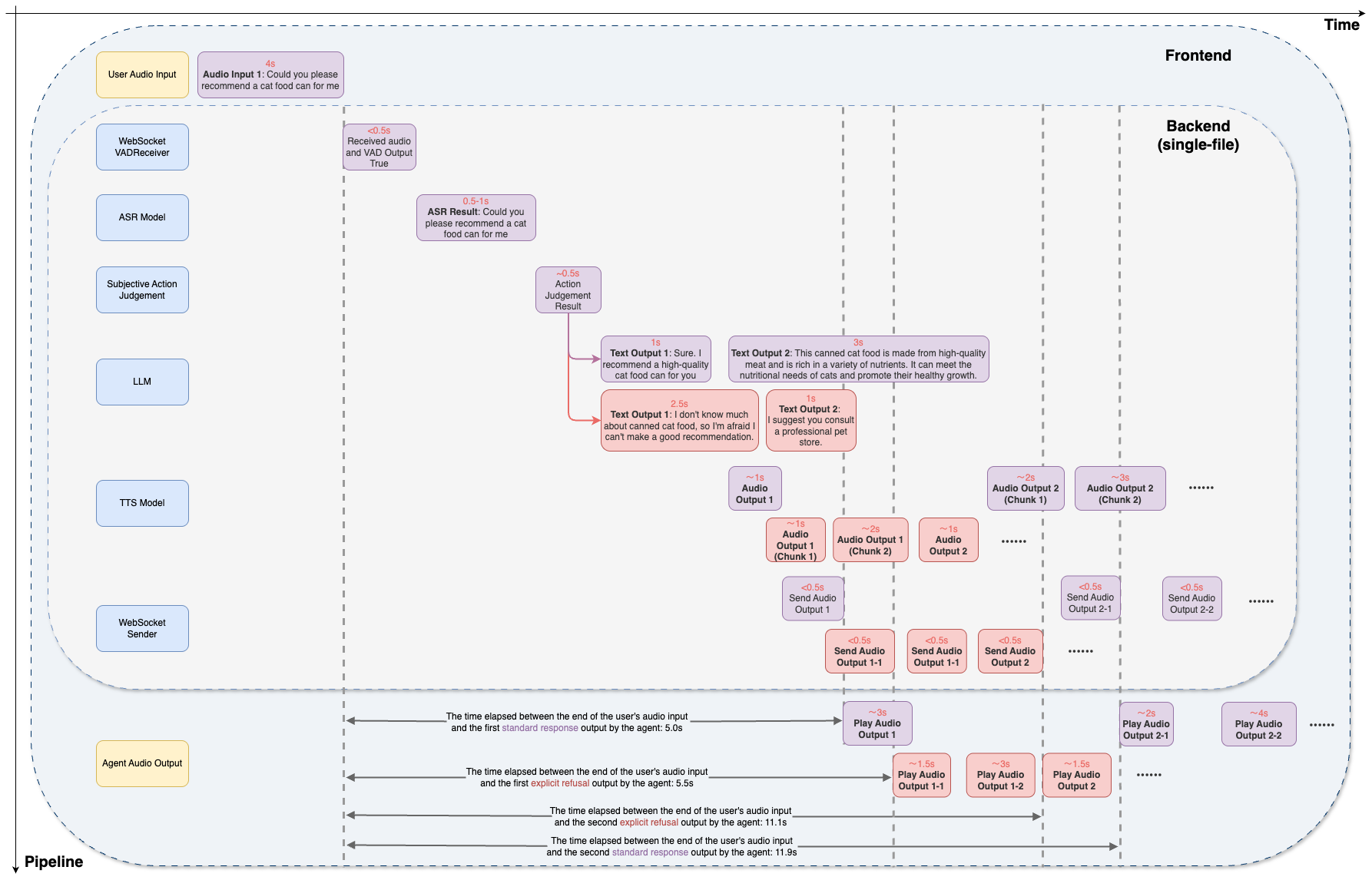 基于 WebSockets 提供的强大机制,该流水线支持全双工交互,即用户可以在与代理交谈的同时进行发言和聆听。此外,流水线还支持打断功能——用户可在对话中的任何时刻通过新的语音输入打断代理,代理会立即停止当前处理任务,转而根据之前的对话内容及打断信息继续处理新输入。