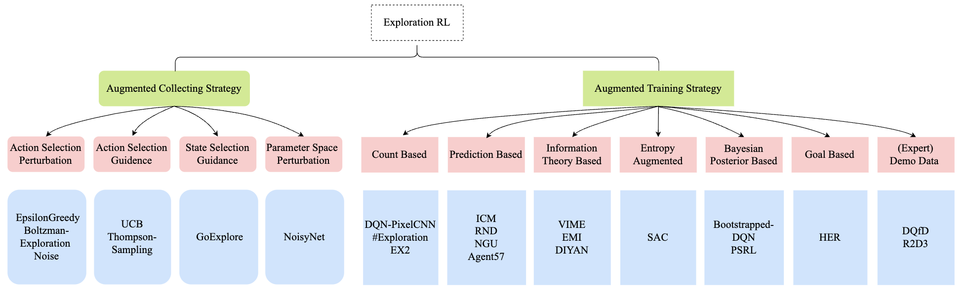 根据探索组件被显式应用的阶段,我们将“探索型强化学习”方法简单地分为两大类:增强型收集策略和增强型训练策略:
