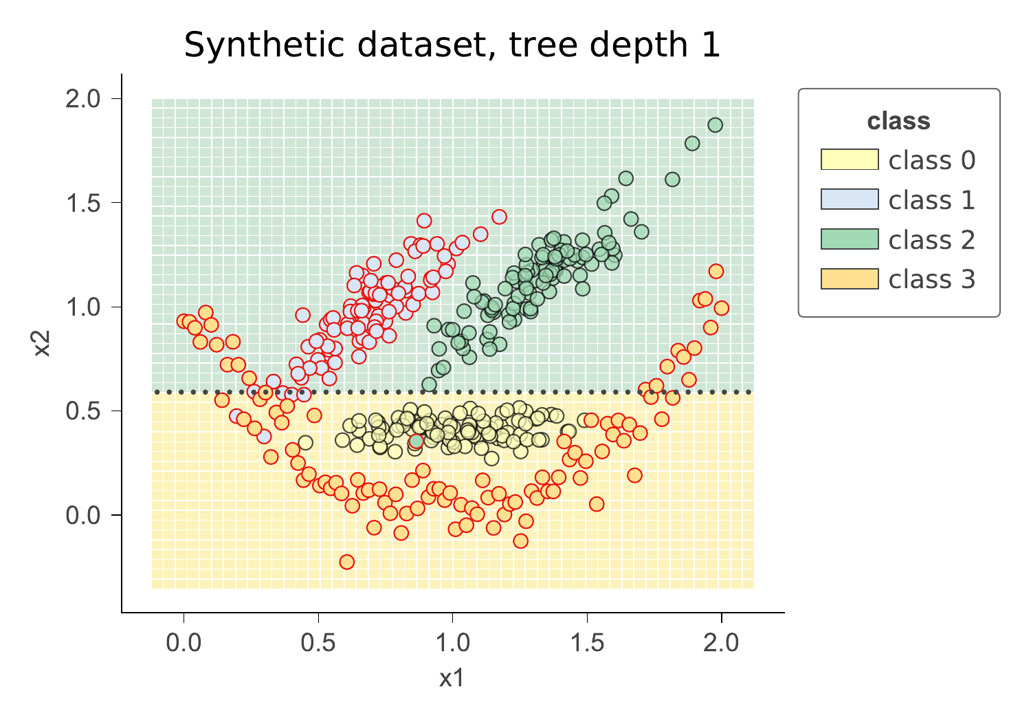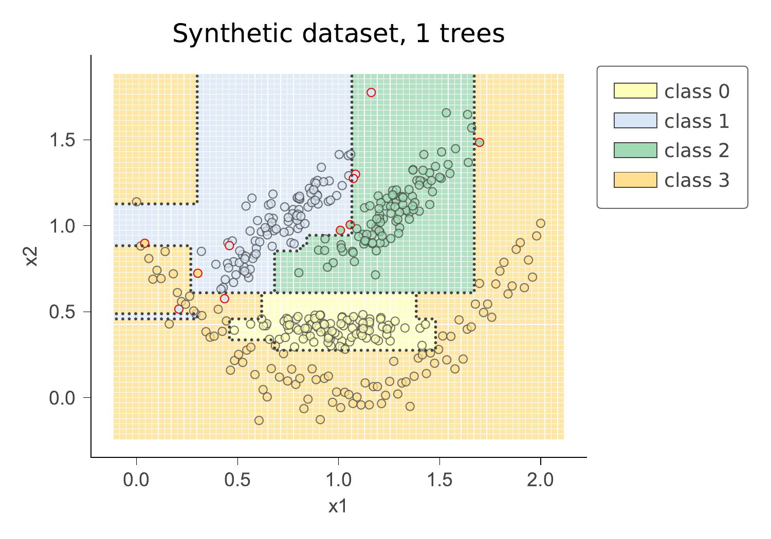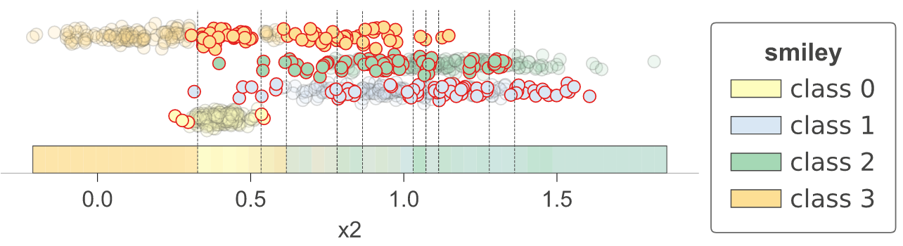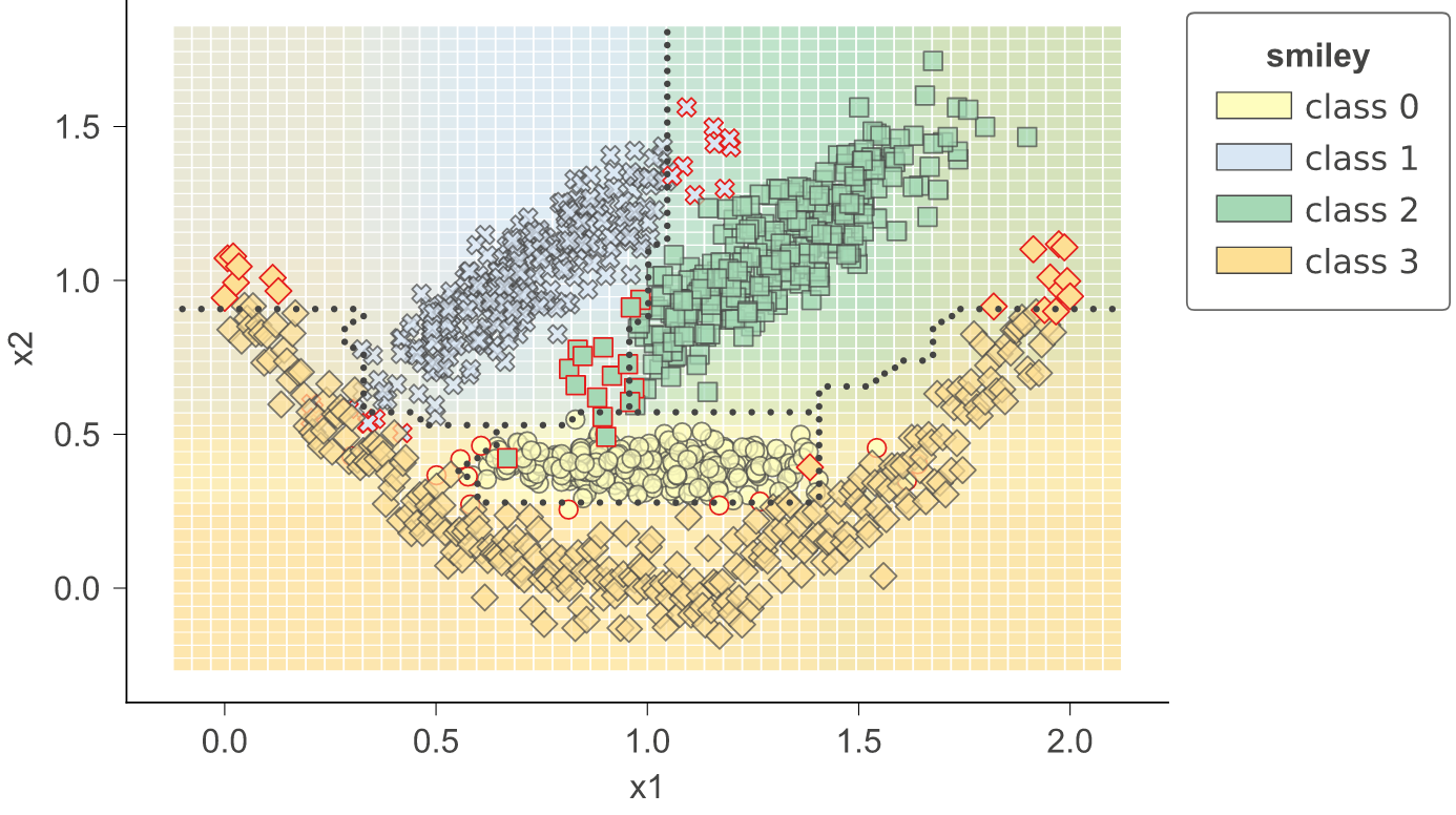 作为一项实用工具,dtreeviz 提供了 dtreeviz.decision_boundaries() 方法,用于展示分类器的一维和二维特征空间,包括表示概率的颜色、决策边界以及被错误分类的样本。值得注意的是,此方法并不局限于树模型,任何实现了 predict_proba() 方法的模型都可以使用。这意味着 scikit-learn 中的任何模型都适用(不过我们也使其能够与定义了 predict() 方法的 Keras 模型配合使用)。由于该方法不专门针对树模型,因此不会使用从 dtreeviz.model() 获取的适配器。更多信息请参阅 classifier-decision-boundaries.ipynb。