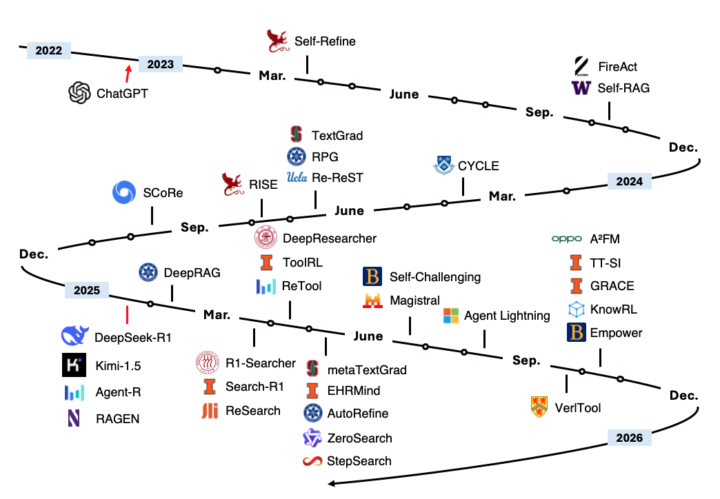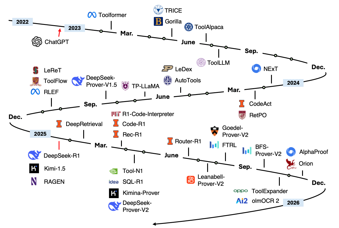 它解决了当前研究分散、缺乏统一分类框架的问题,帮助从业者快速定位前沿方法,如基于强化学习(GRPO、AlphaZero 变体)的工具调用优化、形式化证明中的编译器适配、以及多模态智能体在网页生成等场景中的动态调整机制。资源库不仅收录最新 arXiv 预印本和顶会论文,还附带代码链接与发展时间线,便于复现与对比。