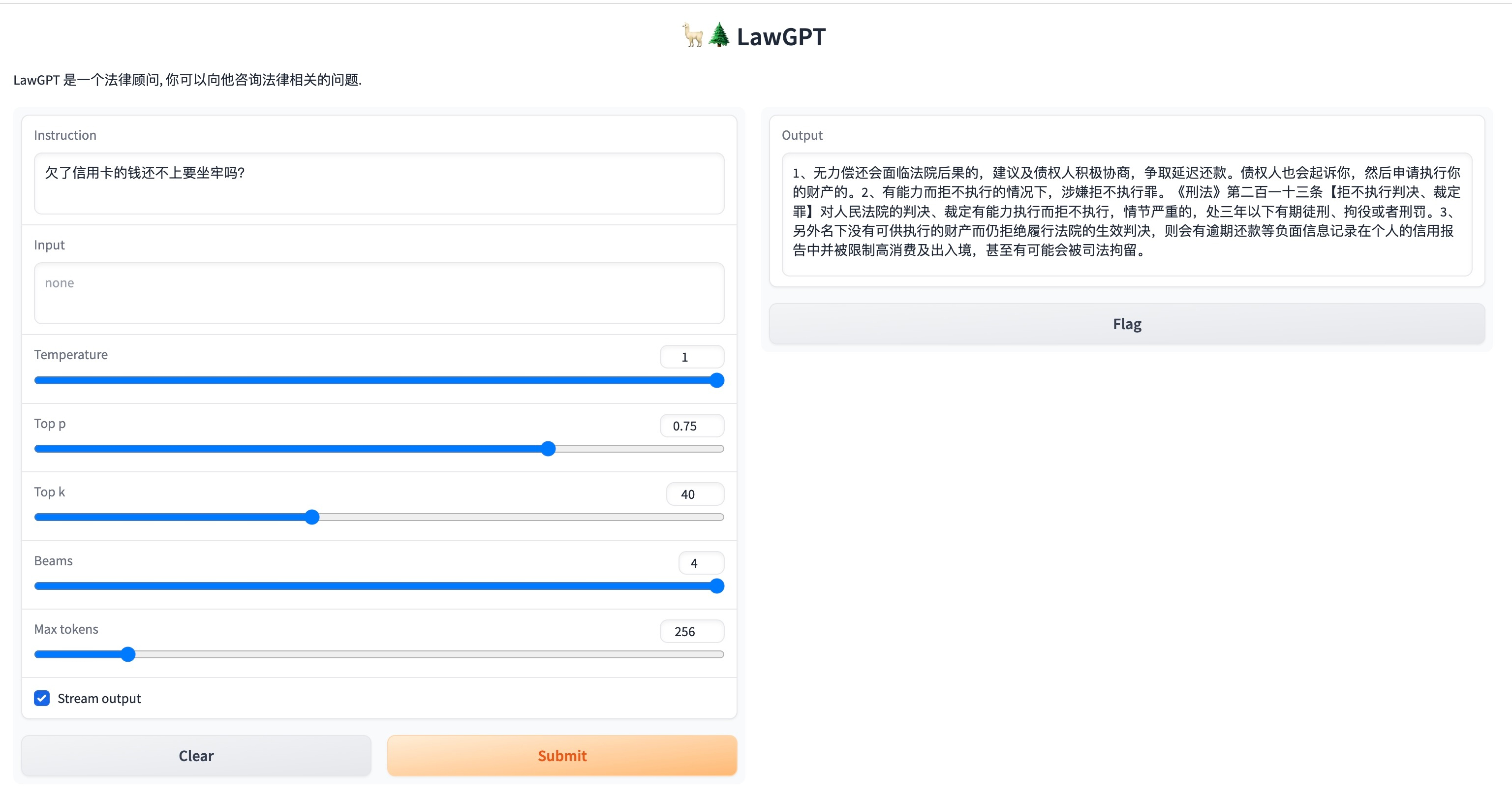 # 下载代码 git clone git@github.com:pengxiao-song/LaWGPT.git cd LaWGPT # 创建环境 conda create -n lawgpt python=3.10 -y conda activate lawgpt pip install -r requirements.txt启动 web ui(可选,易于调节参数)