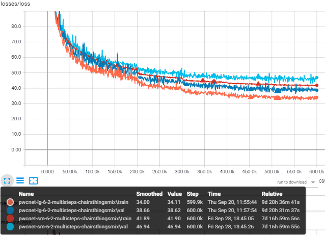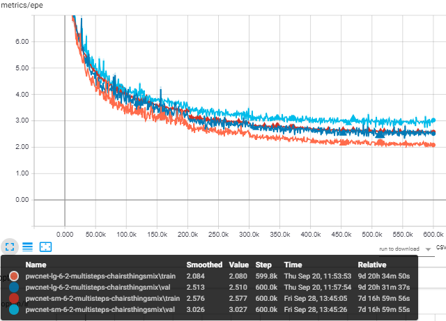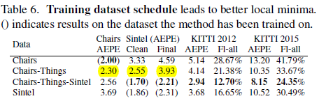 与原始论文不同,我们并未按顺序在 FlyingChairs 和 FlyingThings3D 上进行训练(即先在 FlyingChairs 上预训练,再在 FlyingThings3D 上微调)。这是因为 MPI-Sintel 数据集上的平均光流幅值仅为 13.5,而 FlyingChairs 和 FlyingThings3D 的平均光流幅值分别为 11.1 和 38。在我们的实验中,如果在 FlyingThings3D 上进行微调,反而会在 MPI-Sintel 上得到更差的结果。