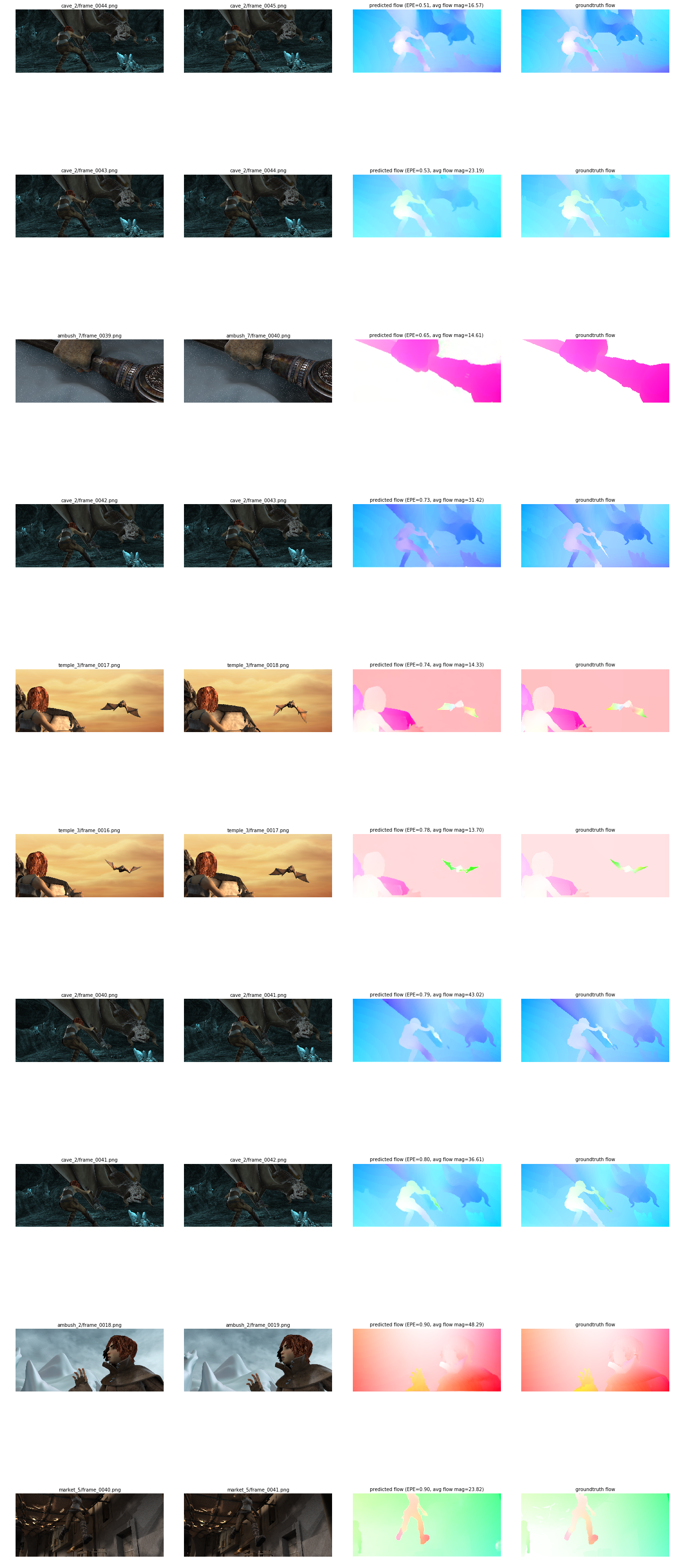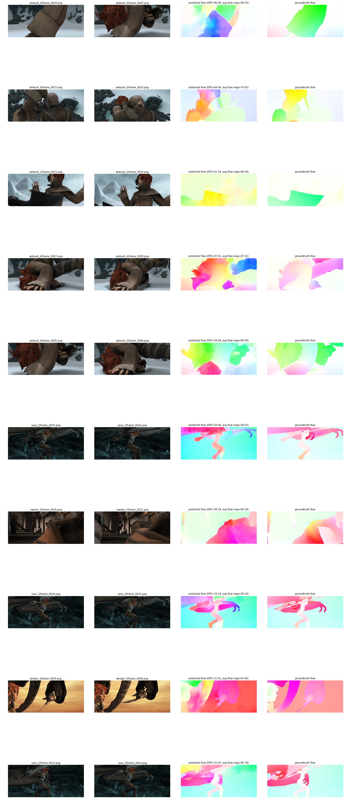 最后,正如“预训练模型链接”部分所示,我们在极具挑战性的 MPI-Sintel ‘final’ 数据集上取得了优于官方论文报道的结果。