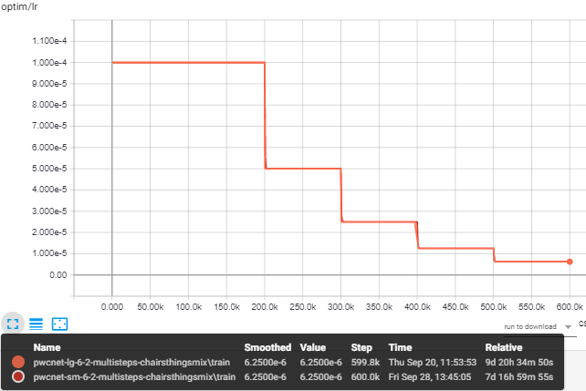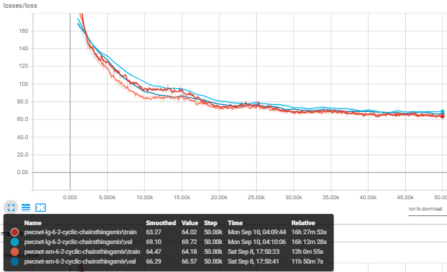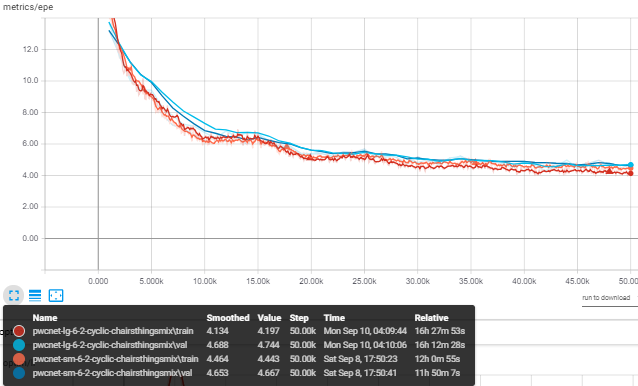 请注意,我们使用略有不同的数据集和学习率调度来训练这些模型。官方论文 [2018a] 中讨论的多步调度如下:Slong 训练 120 万次迭代,批次大小 8;随后 Sfine 微调 50 万次迭代,批次大小 4。而我们的调度仅为 Slong,训练 120 万次迭代,批次大小 8,训练数据混合了 FlyingChairs 和 FlyingThings3DHalfRes。其中,FlyingThings3DHalfRes 是我们自己版本的 FlyingThings3D,其每一对输入图像及其对应的光流真实值均已在每个维度上 缩小了两倍。此外,我们还采用了 不同的增强技术组合。