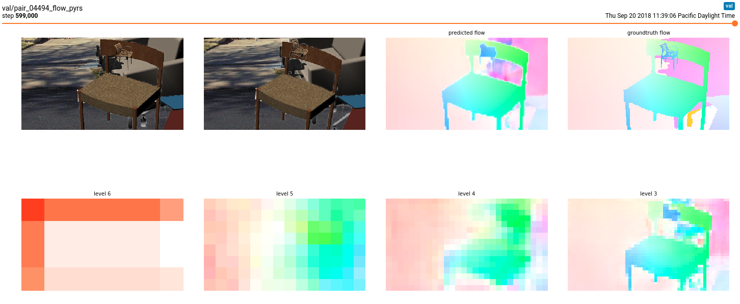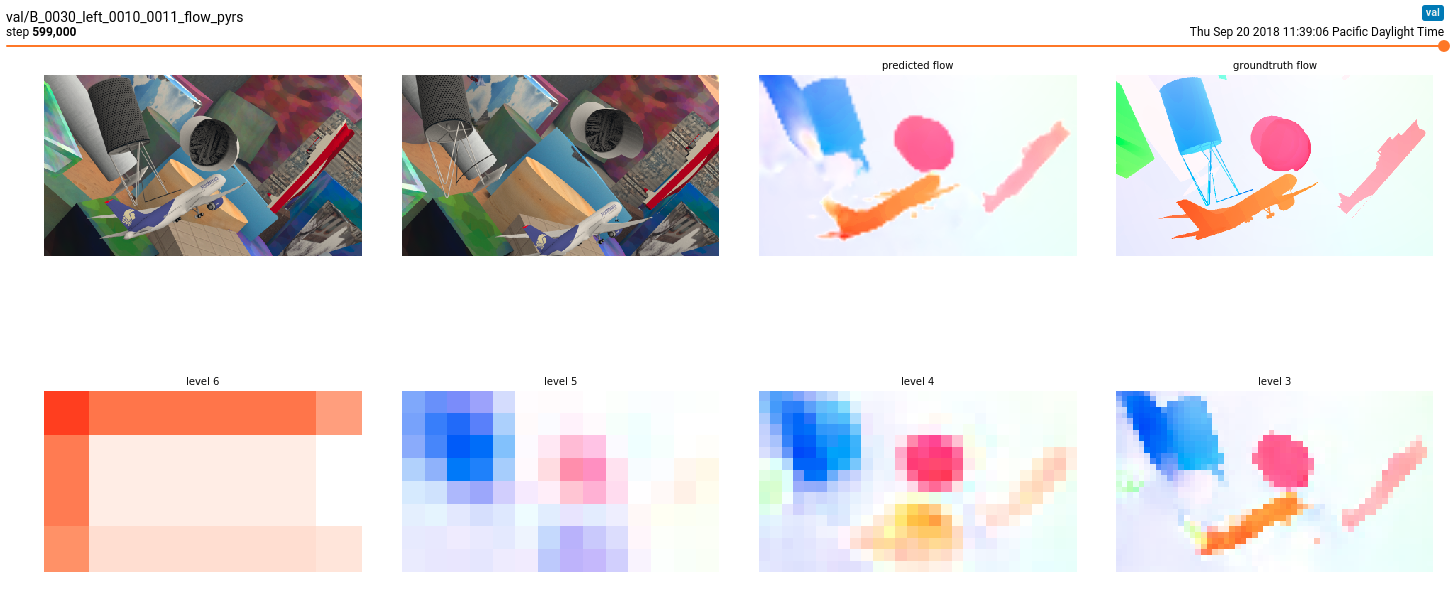 请注意,如果您在运行上述训练笔记本时点击 Tensorboard 中的 IMAGE 选项卡,便可以可视化训练过程中几个验证样本的进展(包括各金字塔层级上的预测光流),如下所示: