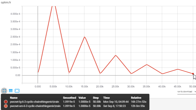 PWC-Net 小模型训练(采用循环学习率调度)中,我们使用 Cyclicshort 调度训练小模型(无密集或残差连接)。