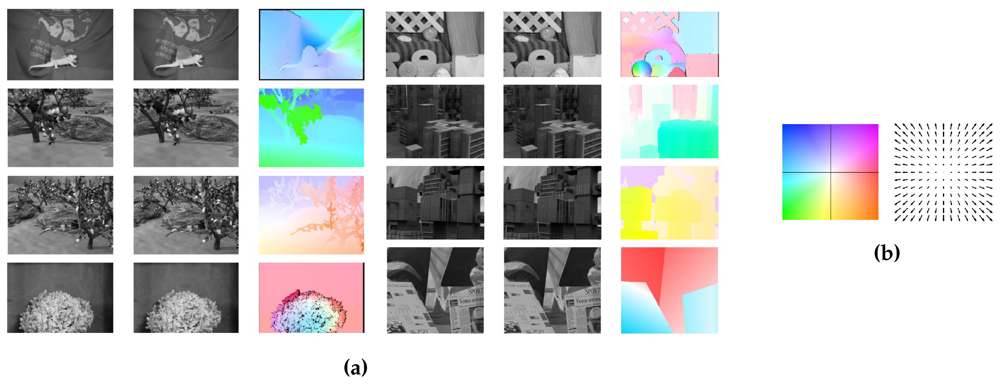 下图 [2017a] (a) 展示了来自 Middlebury 光流数据集的训练样本对(黑白帧 0 和 1),以及它们的彩色编码光流真实值。图 (b) 则说明了用于直观显示 (u,v) 流场的色彩编码规则:通常,向量方向由颜色色调表示,而向量长度则由颜色饱和度编码: