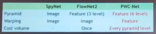 需要注意的是,这里使用的三项优化措施(P/W/C)并非 PWC-Net 所独有。这些技术同样被用于 SpyNet [2016b] 和 FlowNet2 [2016a]。然而,在 PWC-Net 中,这些优化是在“CNN 特征”上进行的,而不是在图像金字塔上: