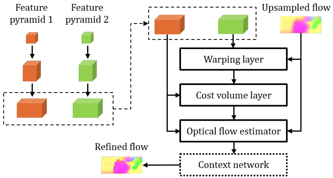 根据 [2018a],PWC Net 通过将领域知识融入网络设计,对 FlowNet2 [2016a] 进行了改进。光流估计的基本思想是:尽管像素在相邻帧之间发生了位置变化,但其亮度在时间上仍能保持基本不变(即“亮度恒定”)。我们可以先在第一帧视频中选取一个像素周围的小区域,然后在第二帧视频中寻找另一个小区域,使得这两个区域之间的某种函数值(例如归一化互相关)达到最大。接着将这个小区域在整个第一帧上滑动并寻找峰值,从而生成所谓的“代价体积”(PWC 中的 C)。这种技术相当稳健(对颜色变化具有不变性),但计算成本较高。在某些情况下,为了减少第一帧中的误检数量,可能需要使用较大的搜索区域,这进一步增加了计算复杂度。