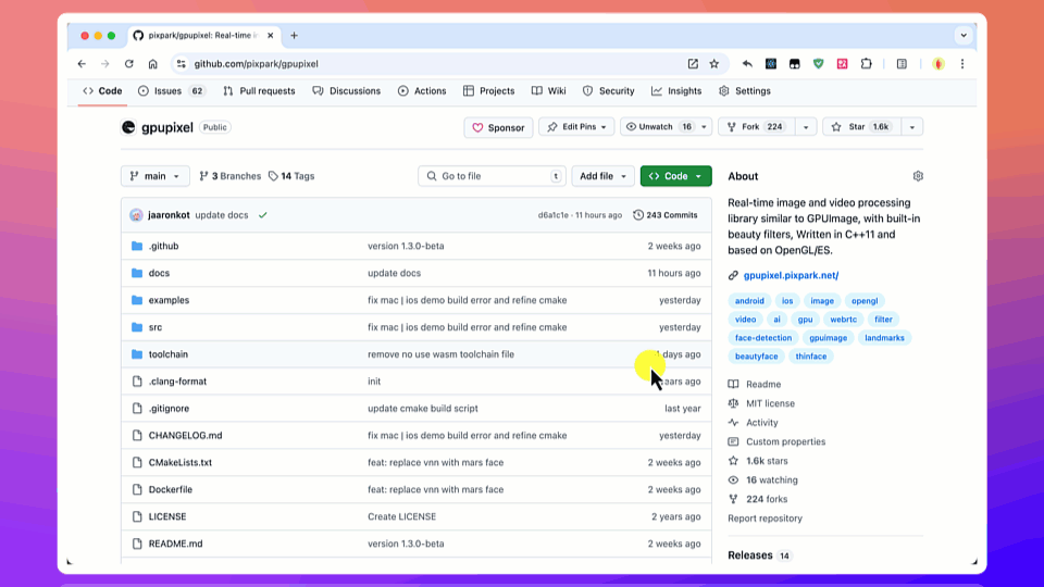无论是开发直播推流应用、短视频编辑器,还是构建即时通讯中的美颜功能,gpupixel 都能提供稳定且丰富的滤镜支持,包括流行的人像美化效果。其核心优势在于极小的资源占用和卓越的渲染速度,确保在移动端设备上也能实现高帧率的实时处理,同时保持代码的简洁与易集成性。