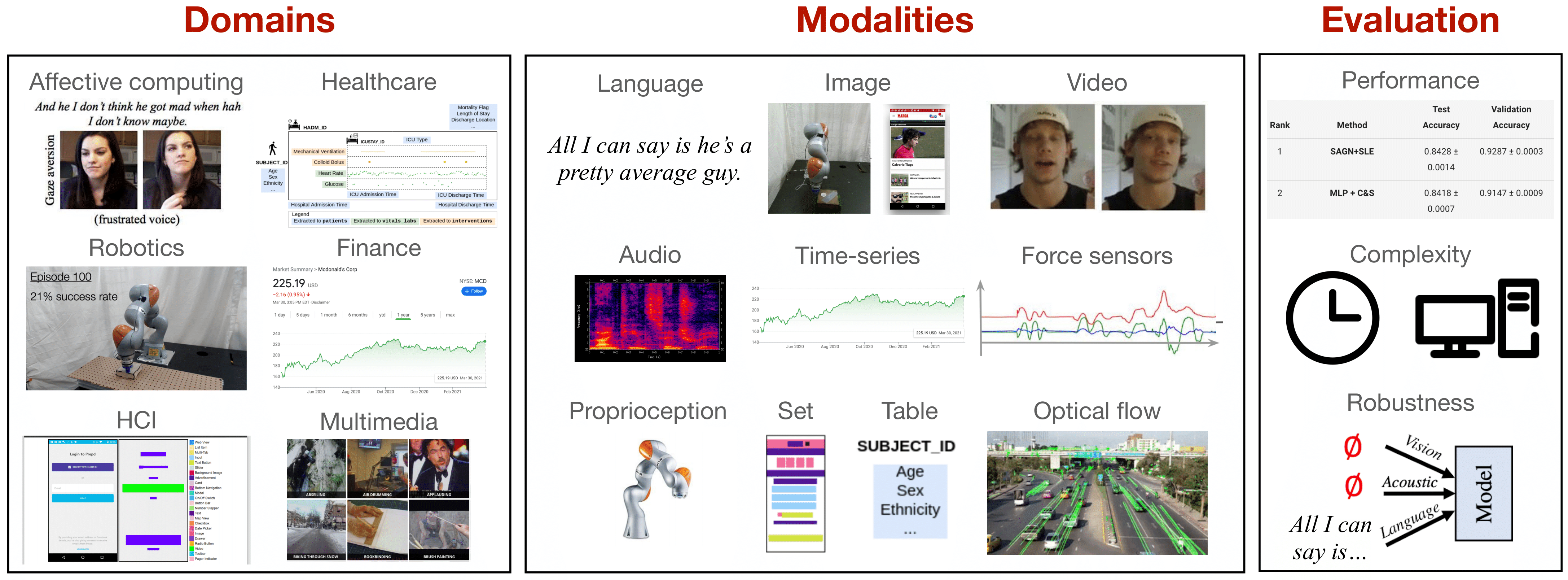 为了加速对尚未充分研究的模态和任务的研究进展,并确保其在实际应用中的鲁棒性,我们发布了 MultiBench,这是一个系统化、统一的大规模多模态学习基准测试平台,涵盖 15 个数据集、10 种模态、20 个预测任务和 6 个研究领域。MultiBench 提供了一个自动化的端到端机器学习流水线,简化并标准化了数据加载、实验设置和模型评估流程。为反映真实世界的需求,MultiBench 旨在全面评估:(1) 跨领域和跨模态的性能;(2) 训练和推理过程中的复杂性;以及 (3) 对噪声和缺失模态的鲁棒性。