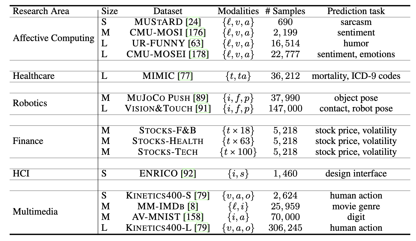- 多媒体:AV-MNIST、MM-IMDb、Kinetics-S、Kinetics-L