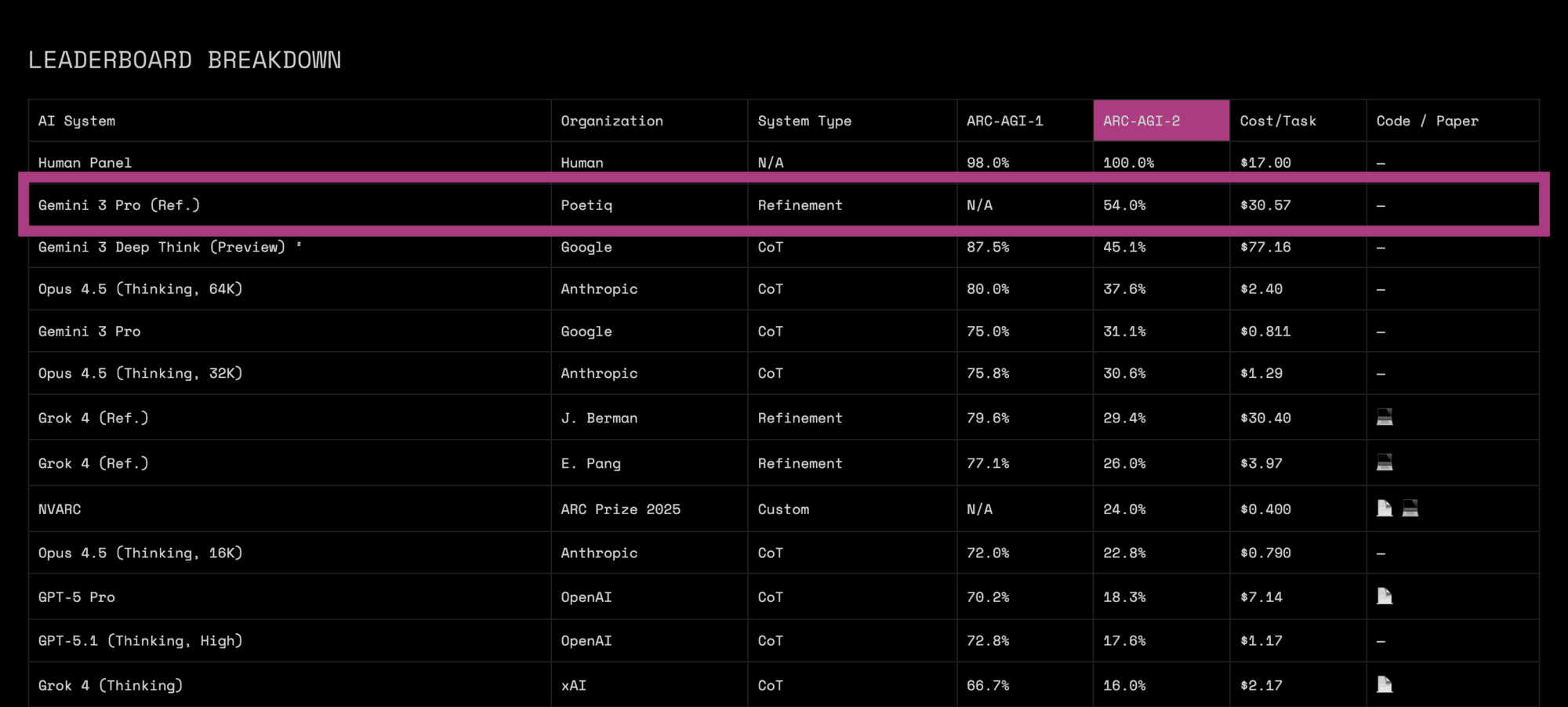 我们的方法现已登上官方排行榜榜首。更多信息请参阅我们的后续文章 《Poetiq 以一半成本打破 ARC-AGI-2 最先进技术记录》。