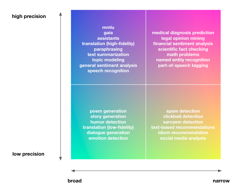 NLP任务的谱系。领域越广泛、精度要求越高,问题就越复杂,蒸馏方法“直接奏效”的可能性也就越小。