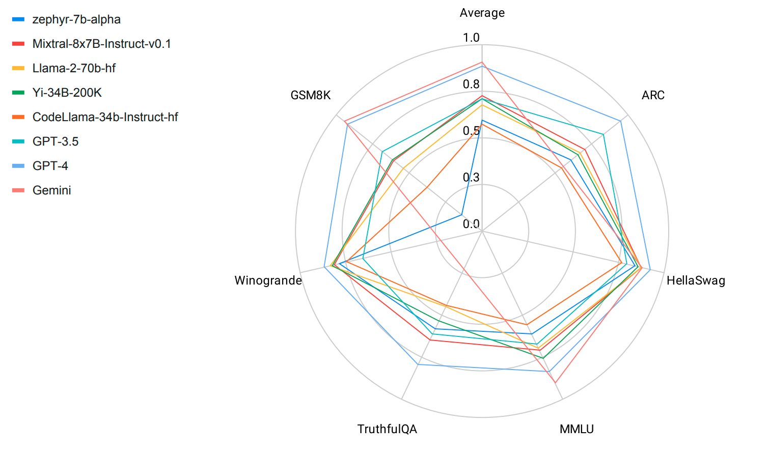 | 指标 | zephyr-7b-alpha | Mixtral-8x7B-Instruct-v0.1 | Llama-2-70b-hf | Yi-34B-200K | CodeLlama-34b-Instruct-hf | GPT-3.5 | GPT-4 | Gemini |
