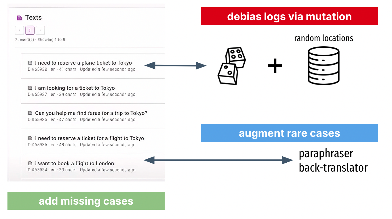 从真实日志中构建的数据集也可能存在多样性或平衡性不足的问题。对于基于日志的数据集而言,过多来自高级用户的示例可能会损害整体数据分布的代表性。可以通过随机变异来去偏,用释义或反向翻译扩充稀有样本,或者手动添加缺失的案例。
