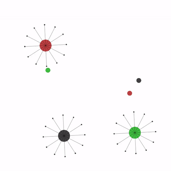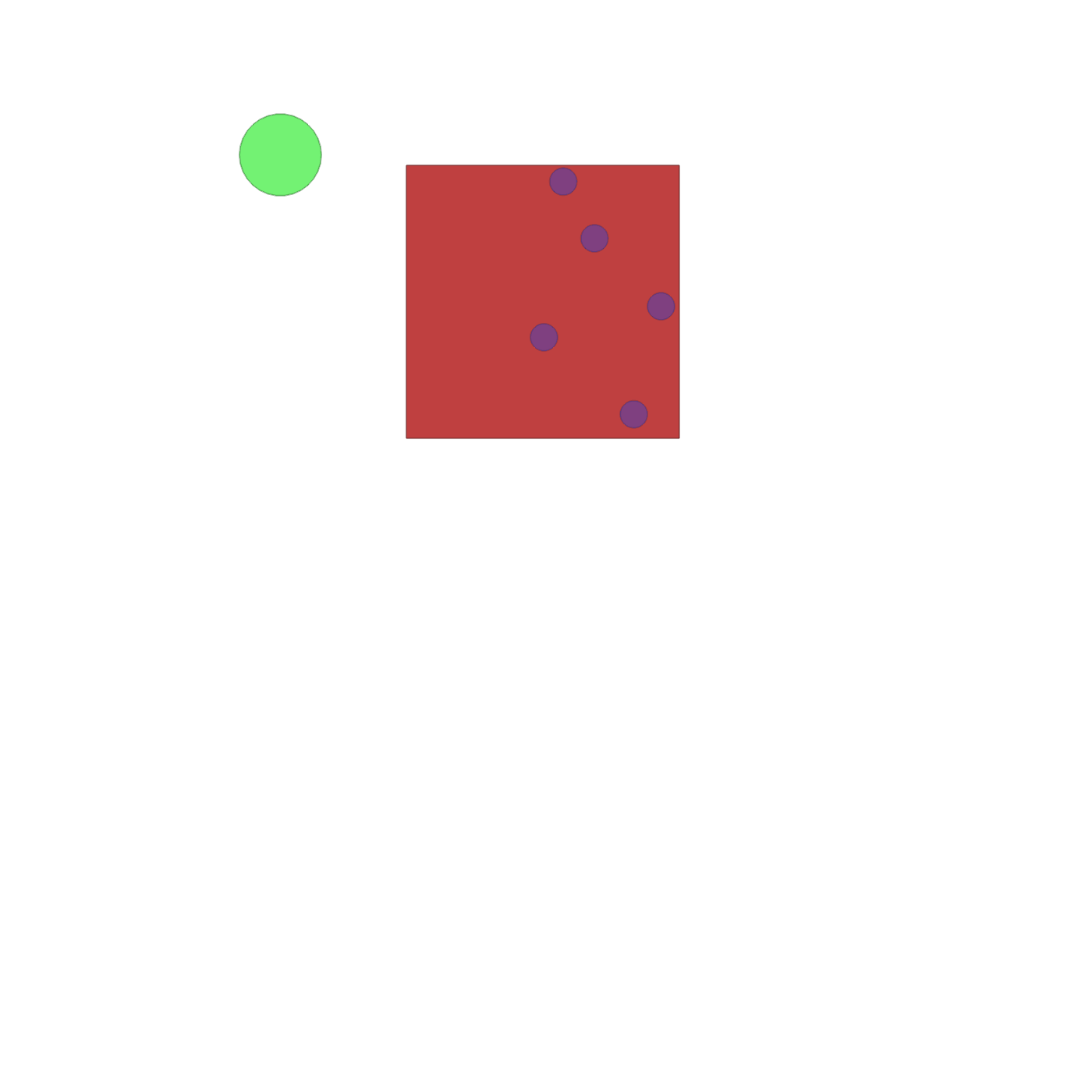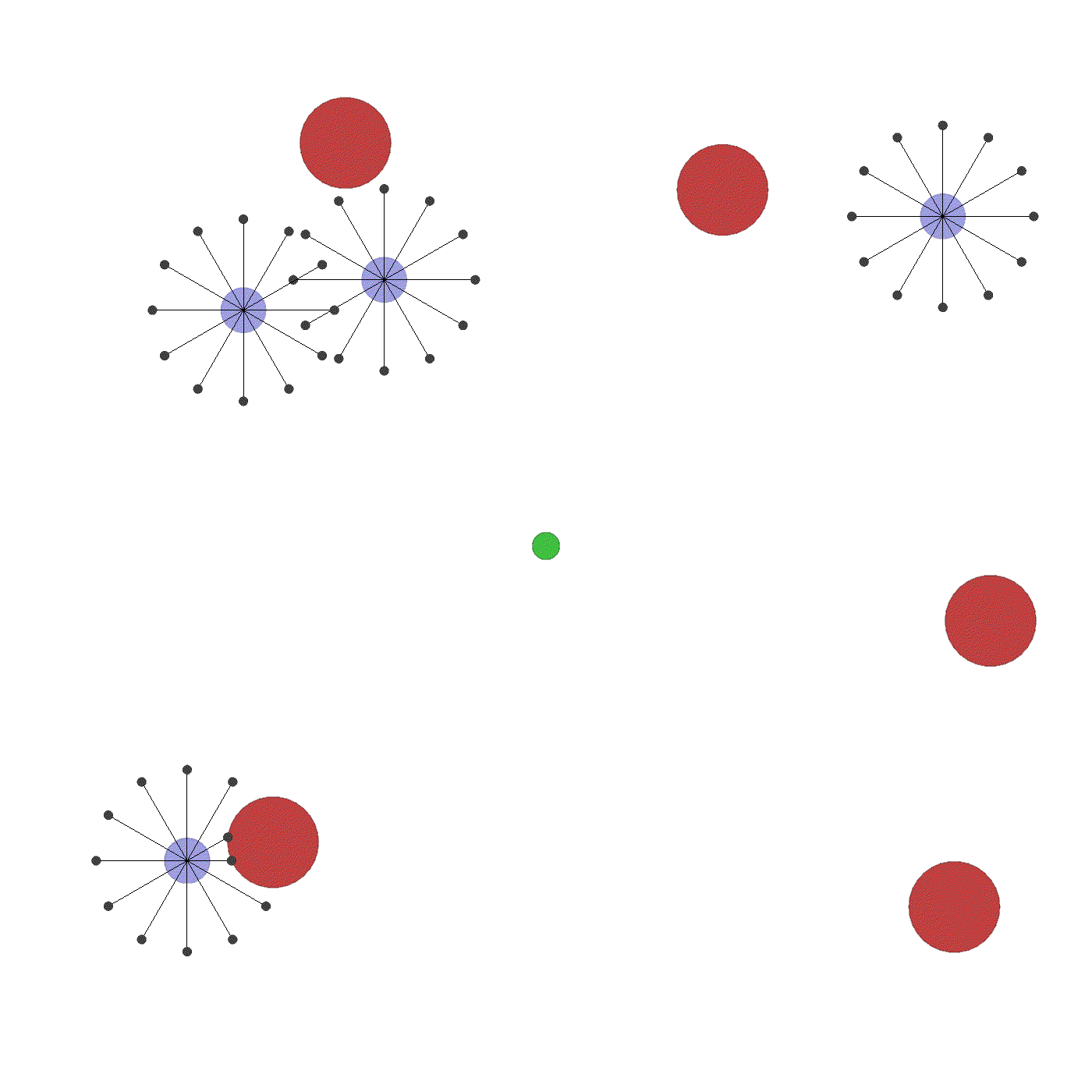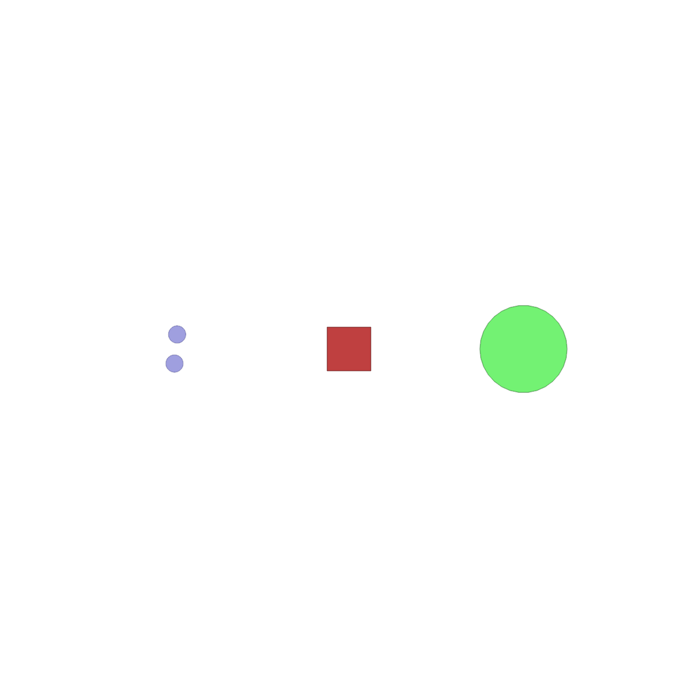 随机生成的智能体需要导航到各自的目标。可以开启碰撞检测功能,智能体也可以使用 LIDAR 来避免相互碰撞。奖励可以选择共享或个体奖励。除了位置、速度和 LIDAR 数据外,每个智能体还可以选择只观察自己与目标之间的相对距离,或者观察自己与所有目标之间的相对距离(在这种情况下,需要智能体表现出异质性才能解决问题)。此外,该场景还允许多个智能体共享同一个目标。 | ![]() |