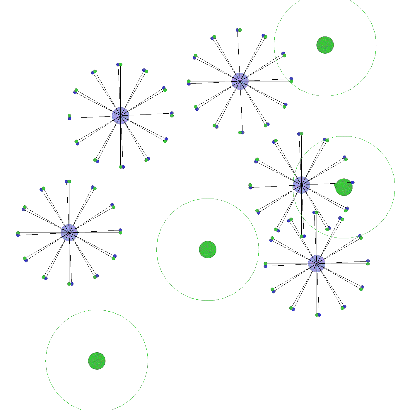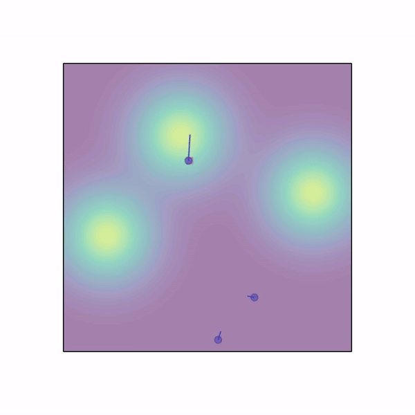n_agents 个智能体随机生成在一个具有高斯分布密度函数的工作空间中,该密度函数由 n_gaussians 个模式组成。智能体需要在这个场中移动并收集样本。整个区域被划分为网格,一旦智能体访问某个格子,就会采集该格子的样本,且样本不会重复出现,采集到的样本将作为奖励分配给整个团队(或仅分配给该智能体,如果 shared_rew=False)。智能体可以使用 LIDAR 来感知彼此。除了 LIDAR、位置和速度观测之外,每个智能体还能观察到周围 3x3 格子内的样本数值。 |