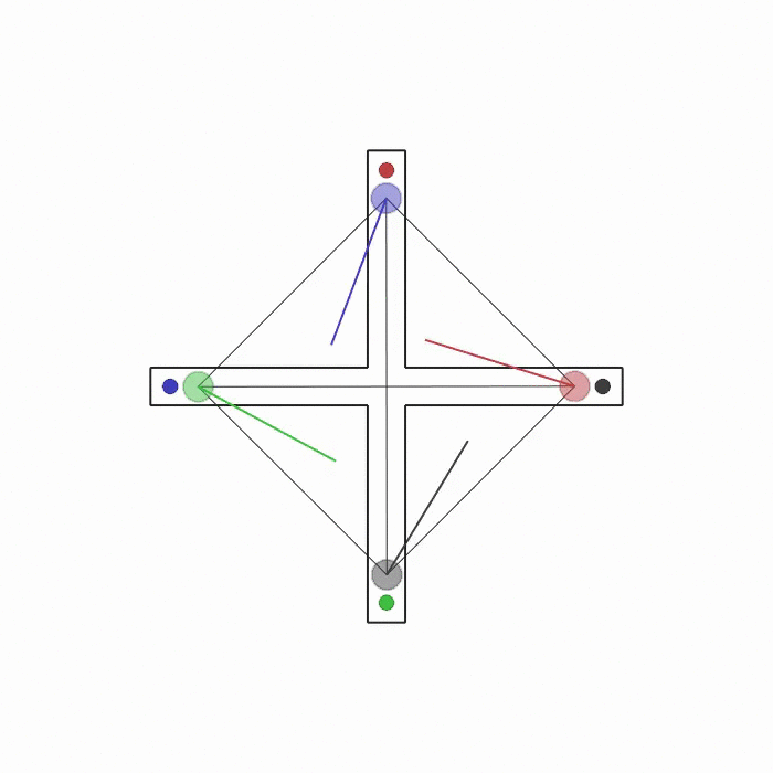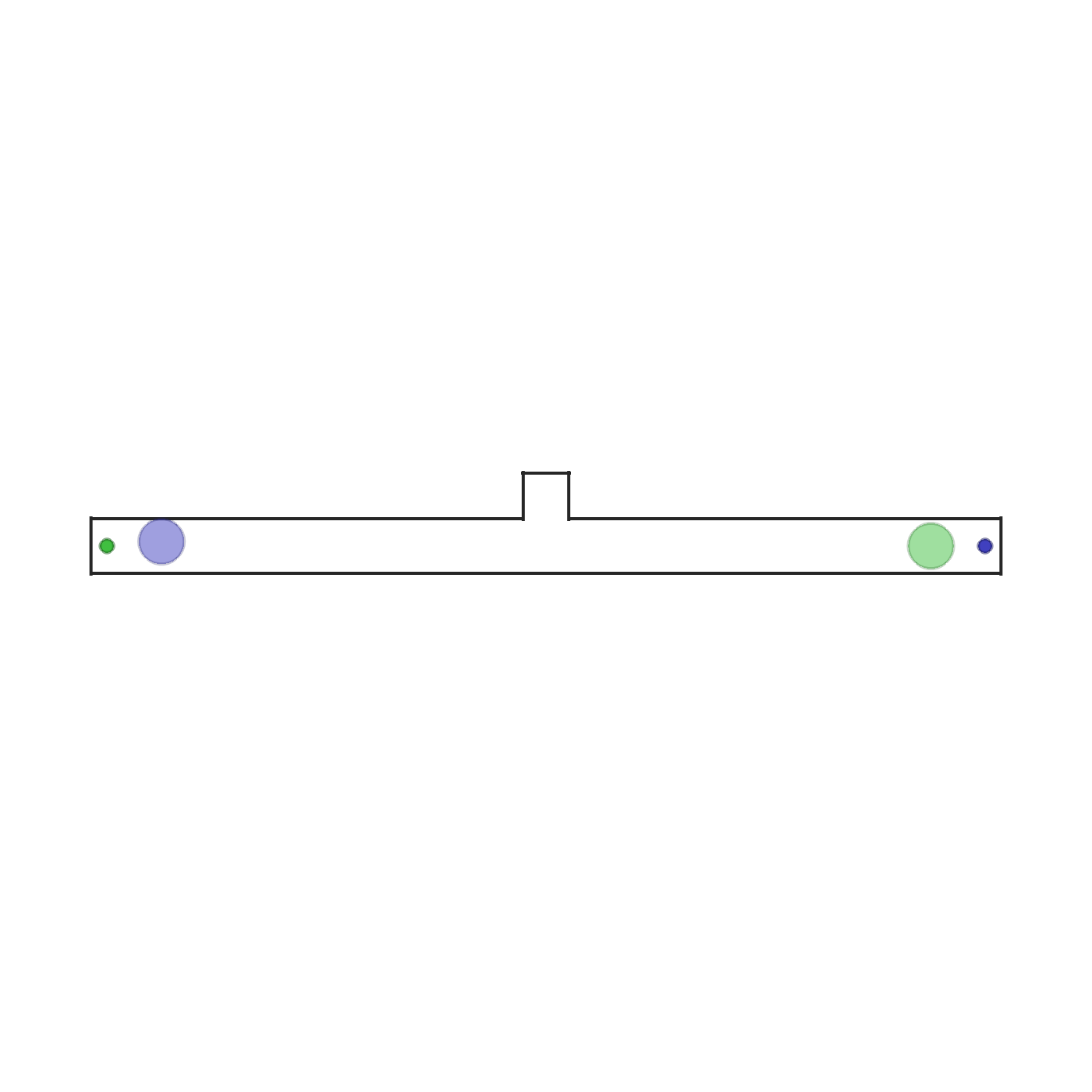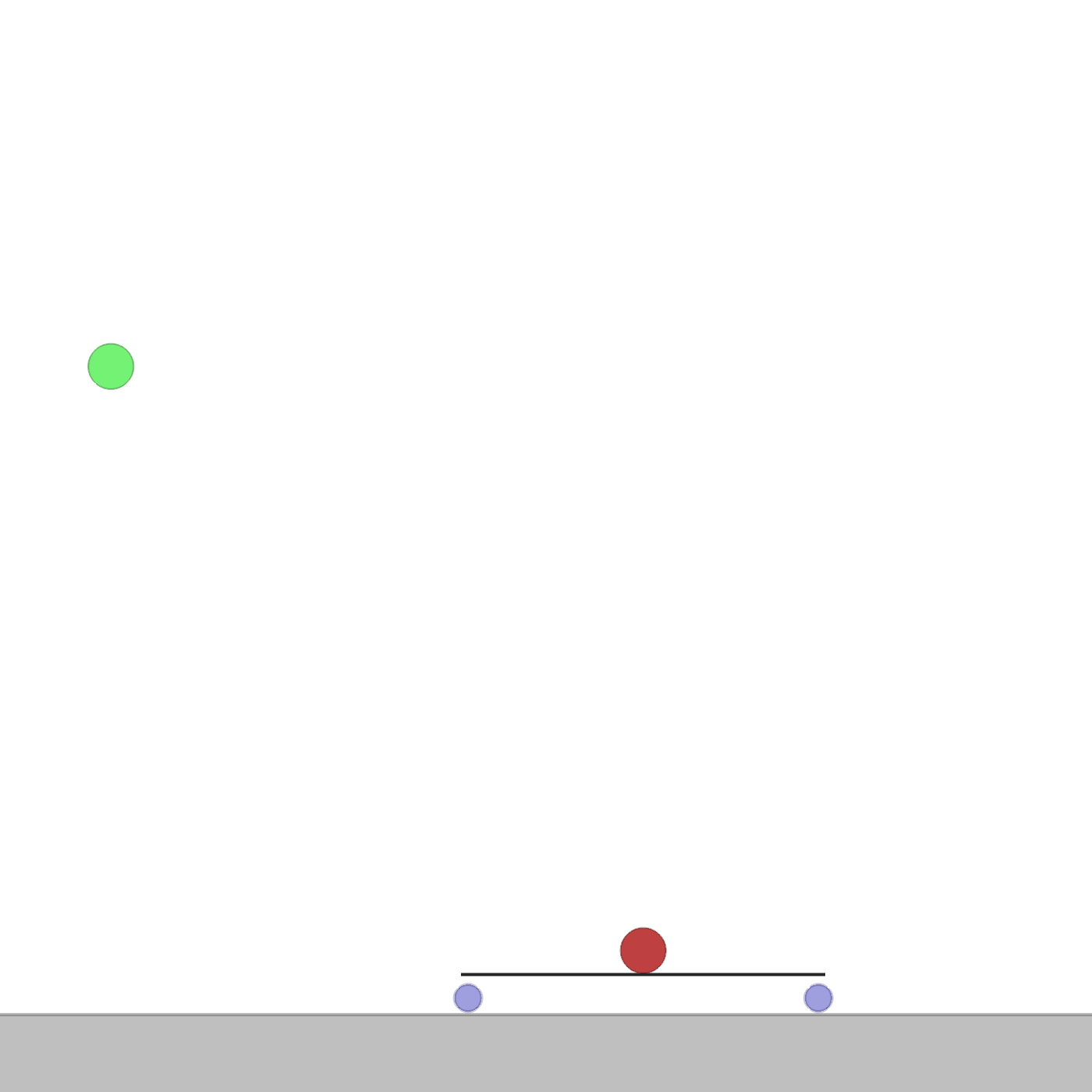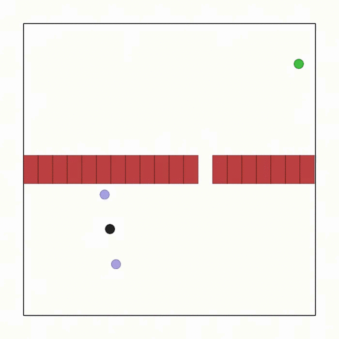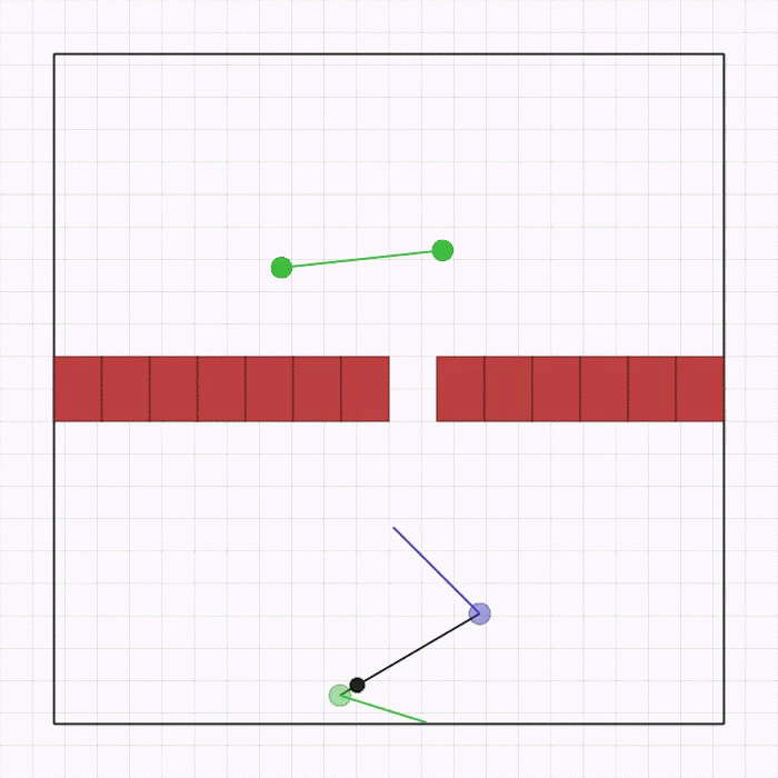 在工作空间中随机生成两个质量不同的智能体。它们的奖励是最大化团队的最大速度,同时最小化团队的能量消耗。最优策略要求重的智能体静止不动,而轻的智能体以最大速度运动。 | ![]() |