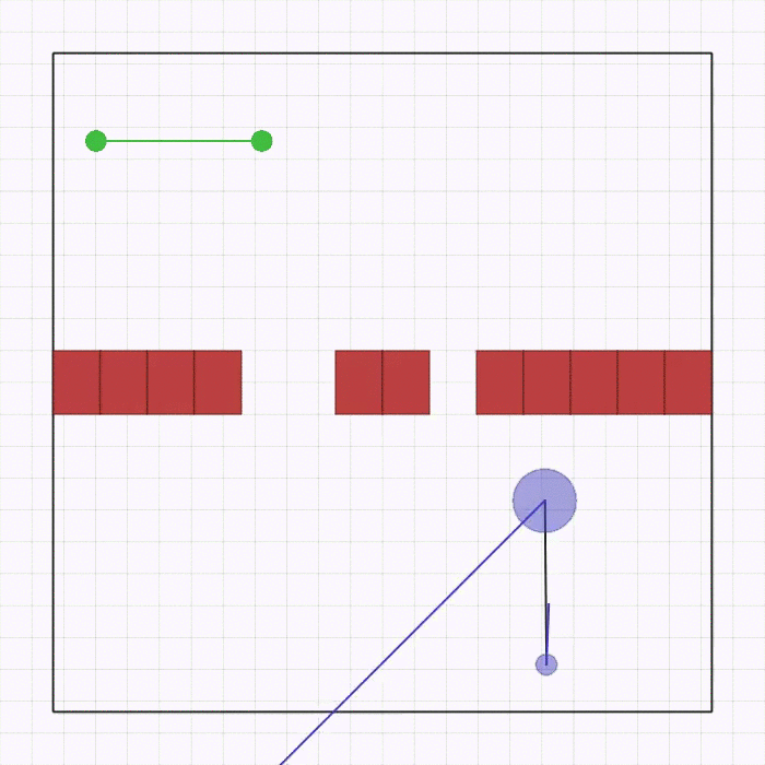 在环境顶部生成 n_agents 个智能体。它们之间通过可碰撞的连杆相互连接,最后一个智能体连接着一个方块。每个智能体的奖励取决于其与底部黑线中心的距离。智能体需要到达这条线,在此过程中可能会相互碰撞以及与环境中的方块发生碰撞。 |