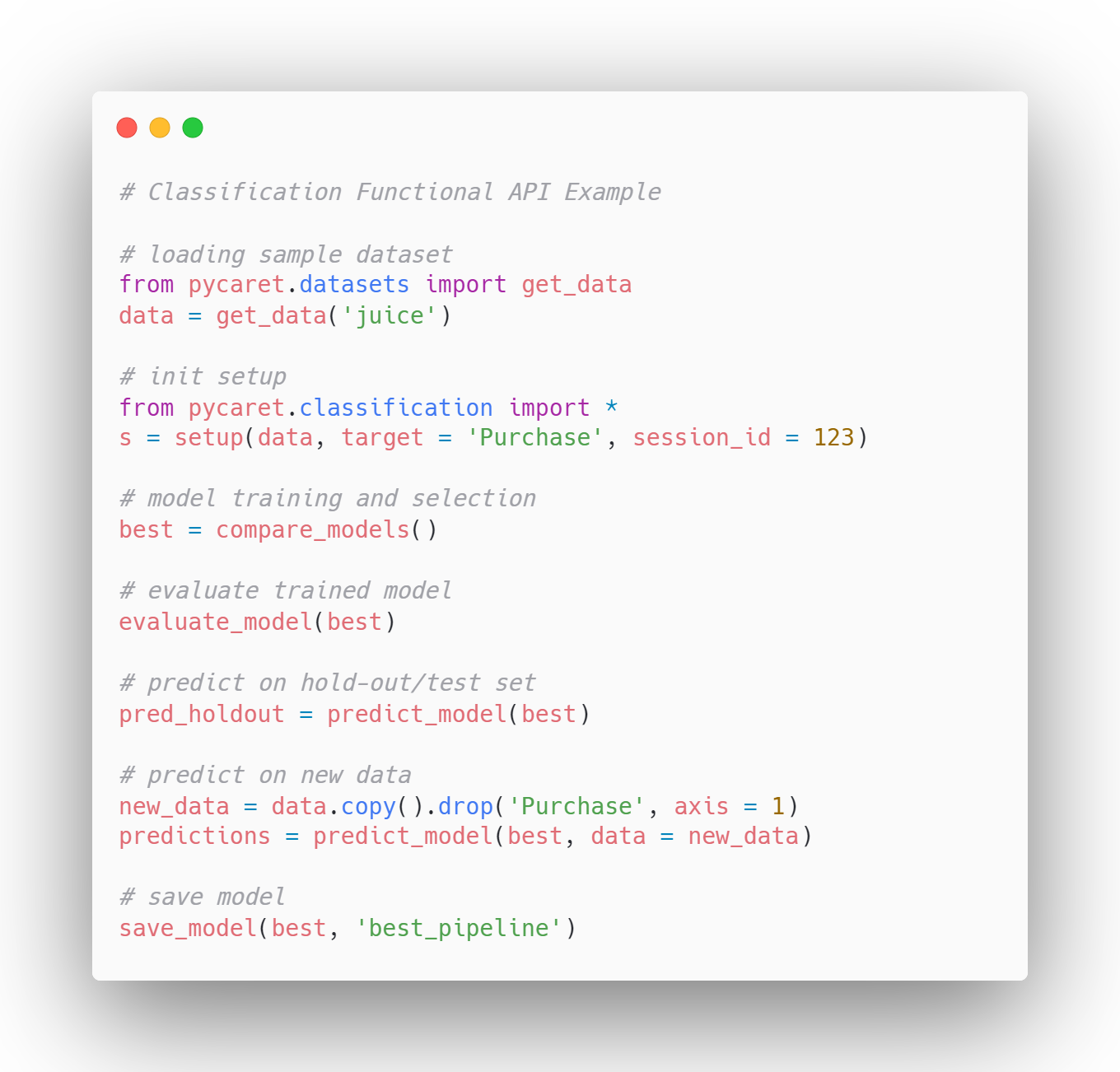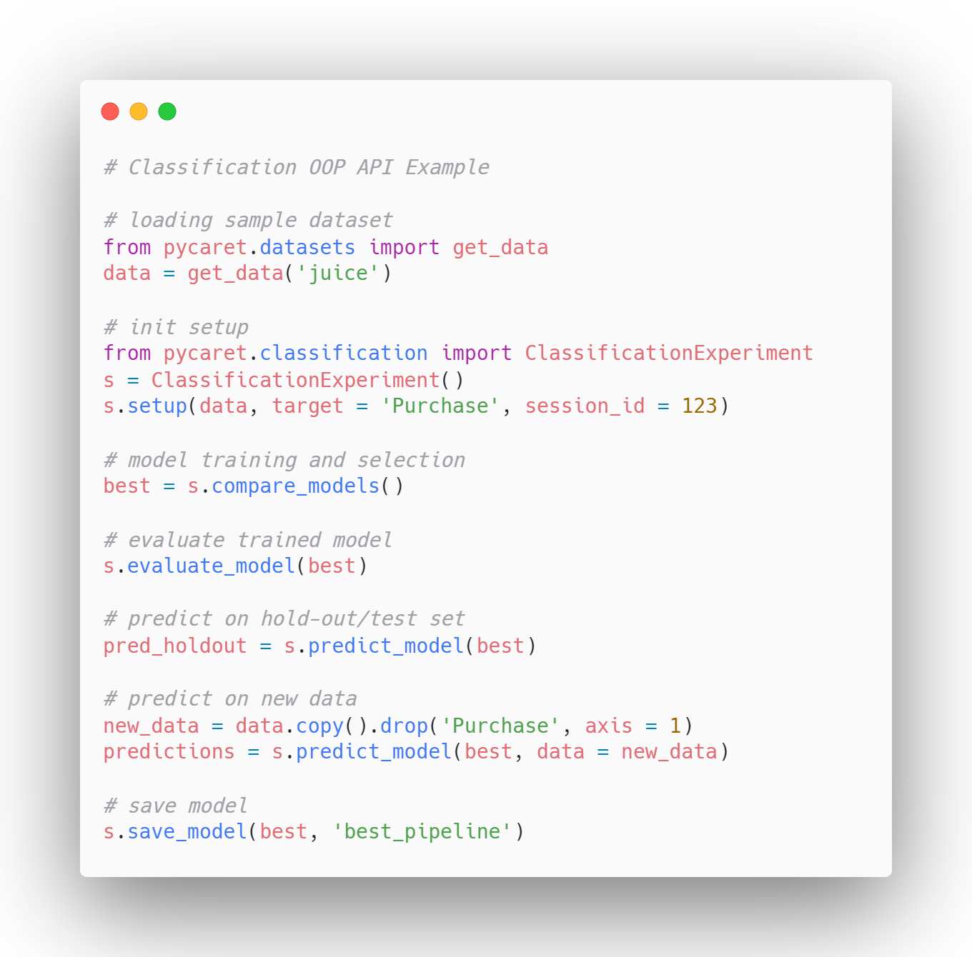 setup()初始化数据,pycaret 即可自动完成所有数据预处理和特征工程,代码量减少 90%。 - 一键模型优选:通过