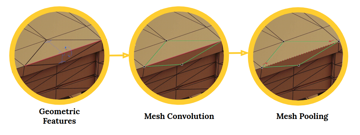 与需要将网格转换为体素或点云的传统方法不同,MeshCNN 的独特之处在于其“基于边”的处理机制。它直接在网格的边(edges)上定义卷积、池化和反池化操作,将网格的拓扑结构作为网络输入的核心部分。这种设计不仅保留了原始的几何特征,还让网络能够自适应地学习边的折叠与简化,从而更精准地理解复杂的三维形态。