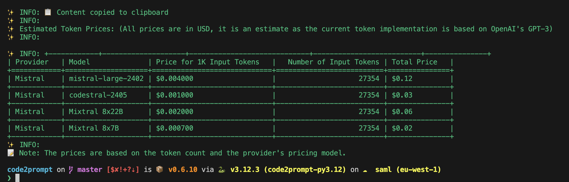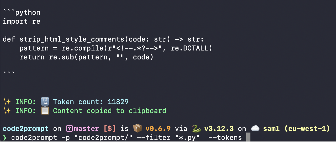--syntax-map选项,为自定义文件扩展名指定特定的语法高亮。例如,你可以指定.inc文件应被视为bash脚本。 - 剪贴板就绪:即时将生成的提示词复制到剪贴板,方便快速进行 AI 对话,简化工作流程。