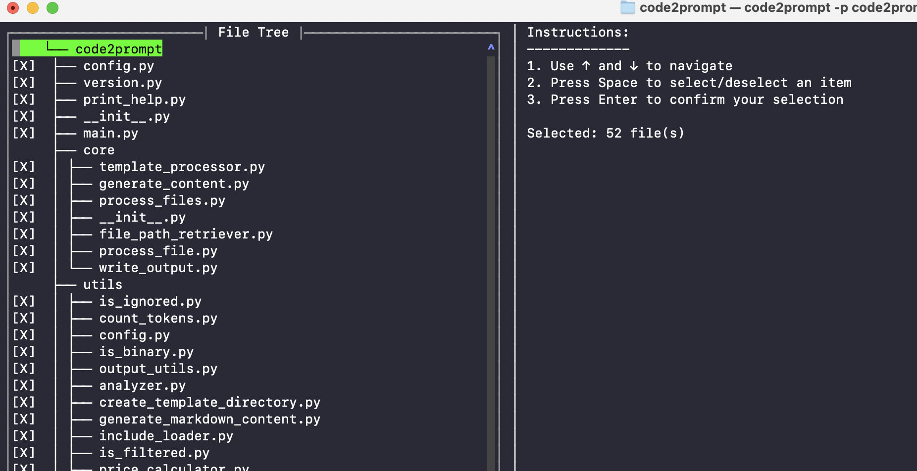 这一模式提升了Code2Prompt的易用性,让你在复杂项目中更轻松地管理文件选择。