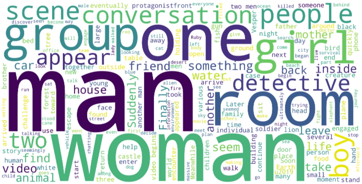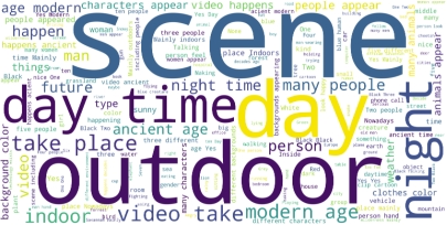 为了分析生成描述的词分布,我们计算了它们的分布。生成的描述词分布如图 B6 所示,其中包括常见物体(男人、女人、人、女孩等)、属性(侦探、各种、小、白色等)、位置(内部、后面、南边、旁边等)、场景(房间、房子、建筑、办公室等)、动作/事件(交谈、进入、离开、拿取等)等。