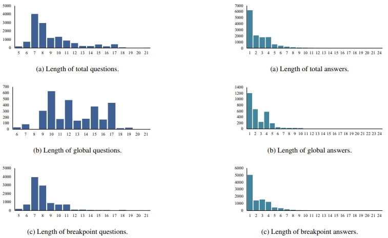 MovieChat-1K 在分段片段级别上展示了多样化的问答对长度。尽管全局模式和断点模式之间的问答对分布有所不同,但大多数问题的长度倾向于集中在 5-15 个单词之间,而答案的长度通常少于 10 个单词。