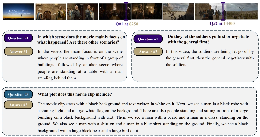 据我们所知,目前尚未建立长视频理解数据集。我们的工作代表了创建并公开此类数据集的第一步。我们创建了 MovieChat-1K,包含 1K 个长视频及对应的 1K 个密集描述(dense captions),以及 13K 个视觉问答对(visual question-answer pairs)。对于每个视频,我们手动设置并提供 1 个覆盖整个视频的密集描述,3 个全局模式(global mode)的问答对,以及 10 个带时间戳的断点模式(breakpoint mode)的问答对。