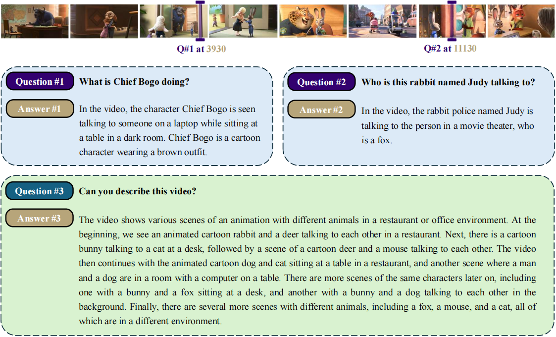 | InfiniBench | 全局外观:6.59 • 场景转换:6.41 • 角色动作:4.51 • 时间顺序:36.99 • 局部视觉:17.76 • 摘要:0.14 • 深层上下文:0.55 • 剧透问题:0.34 • 多个事件:0.85 • 平均:14.45/0.47 |