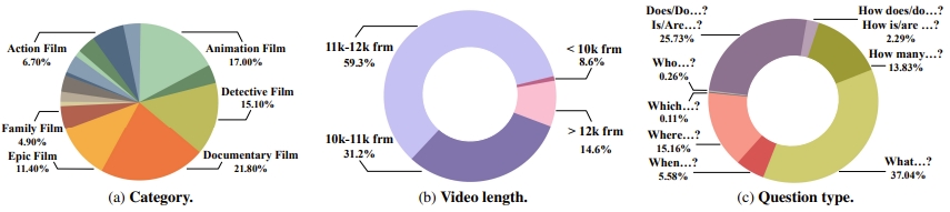 我们从 15 个流行类别中收集了视频,分布各不相同,包括纪录片、侦探片、动画片等。其中,每个视频由多个交替的场景组成,在集合背景下贡献了多样且动态的视觉叙事。超过 90% 的视频时长范围为 10K 到 12K 帧,而 14.6% 的视频时长超过 12K 帧。只有 8.6% 的视频时长少于 10K 帧。