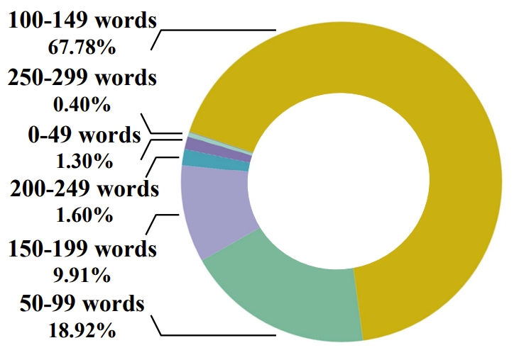 为了促进对长视频的更详细理解,我们为每个视频提供了一个密集描述。MovieChat-1K 在分段片段级别上展示了多样化的描述长度。大约三分之二的片段拥有 100-149 个单词的描述,而五分之一的片段描述少于 100 个单词。约 11% 的片段拥有超过 150 个单词的长描述。