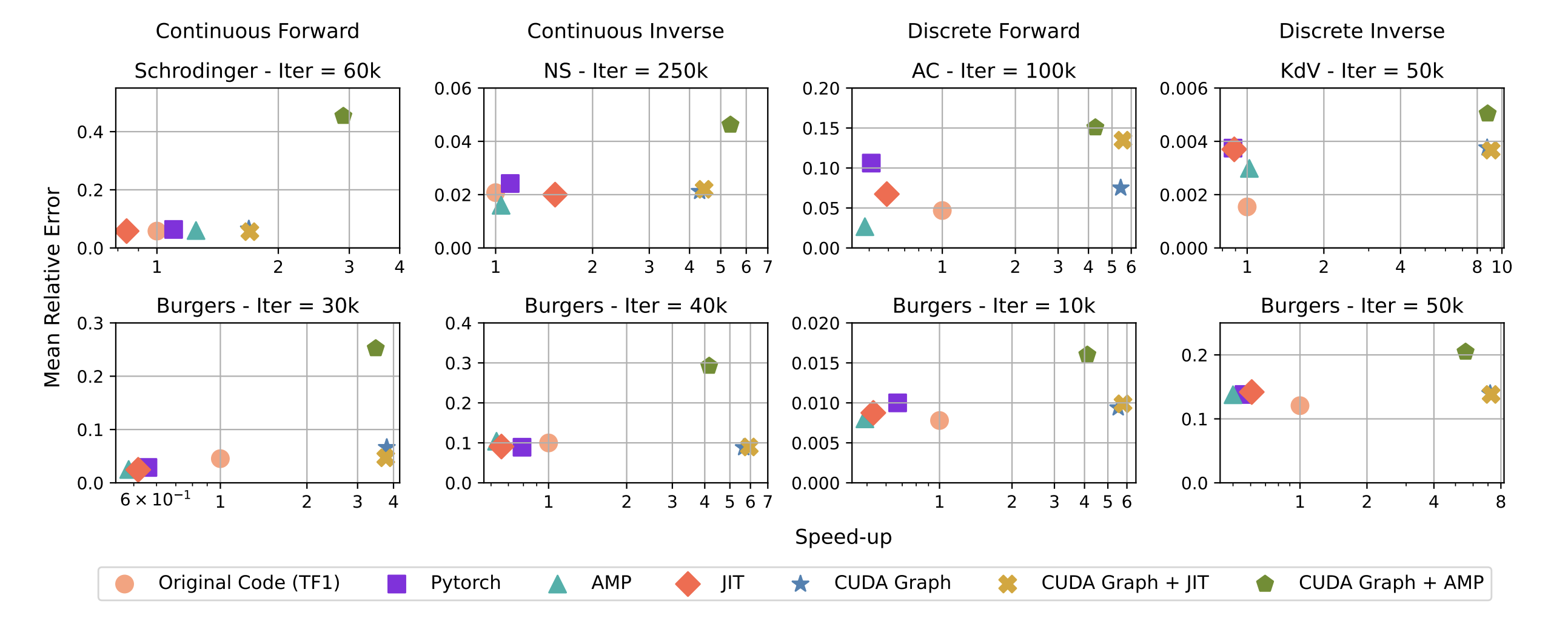 我们的软件包引入了基于 PyTorch 实现的物理信息神经网络(PINNs)。其突出特点是集成了 CUDA 图和 JIT 编译器(TorchScript)来编译模型,与原始 TensorFlow v1 实现相比,性能显著提升,最高可达 9 倍。