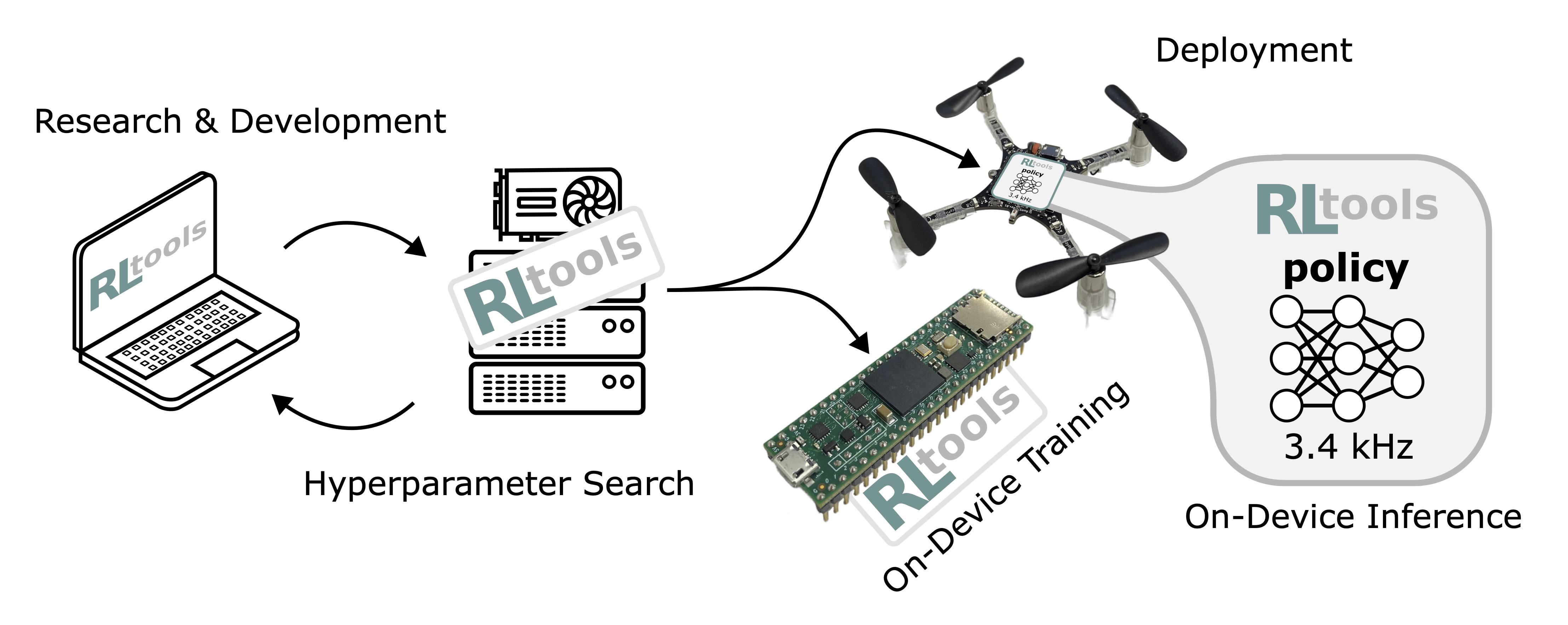 对于算法研究人员和嵌入式开发者而言,rl-tools 极大地降低了实验门槛。你无需依赖昂贵的 GPU 集群,仅需一台普通的 MacBook 或类似设备,即可在短时间内完成如机械臂控制、赛车驾驶或无人机飞行等高难度任务的模型训练。其独特的技术亮点在于对计算资源的极致利用,不仅支持在浏览器中直接运行演示,还能将训练好的模型高效部署到资源受限的微控制器上,实现高频次的实时推理。