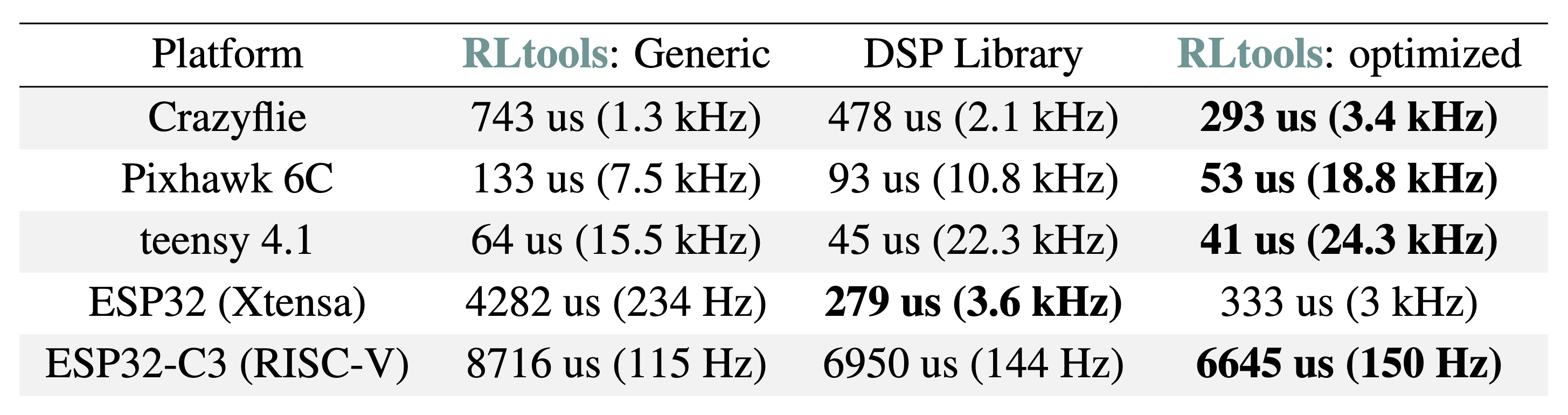 - 无缝端侧部署:rl-tools 原生支持 C++ 且无重型依赖,导出的模型可直接编译运行在微控制器上,消除了环境适配痛点,实现了“训练即部署”。