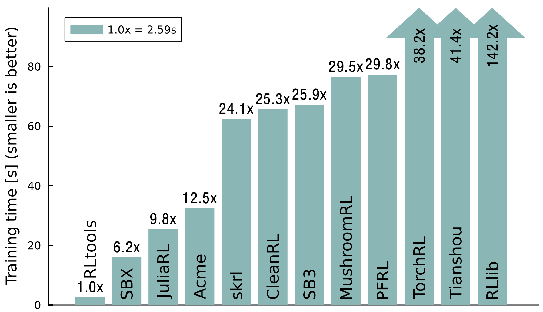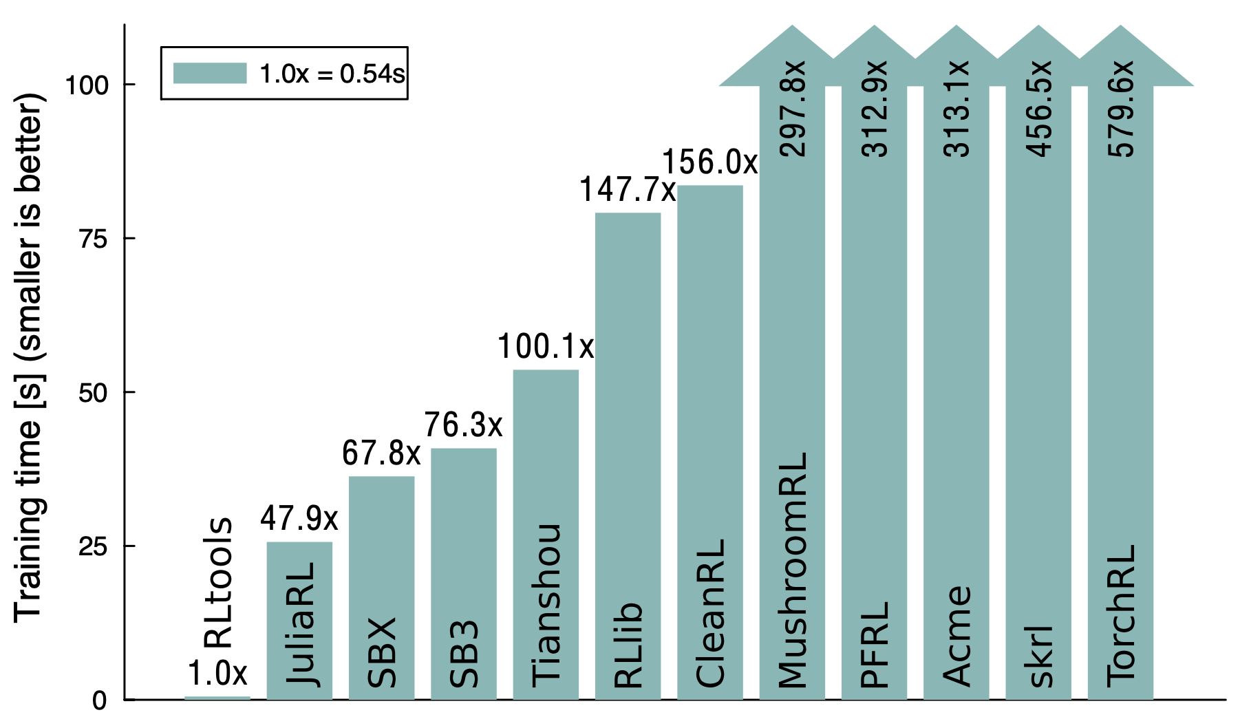 rl-tools 是一款专注于极致性能的深度强化学习开源库,旨在解决传统框架在训练速度和资源消耗上的瓶颈。它通过高度优化的 C++ 后端架构,实现了比主流库更快的训练效率,让复杂的强化学习算法能在普通笔记本电脑甚至微控制器上流畅运行。