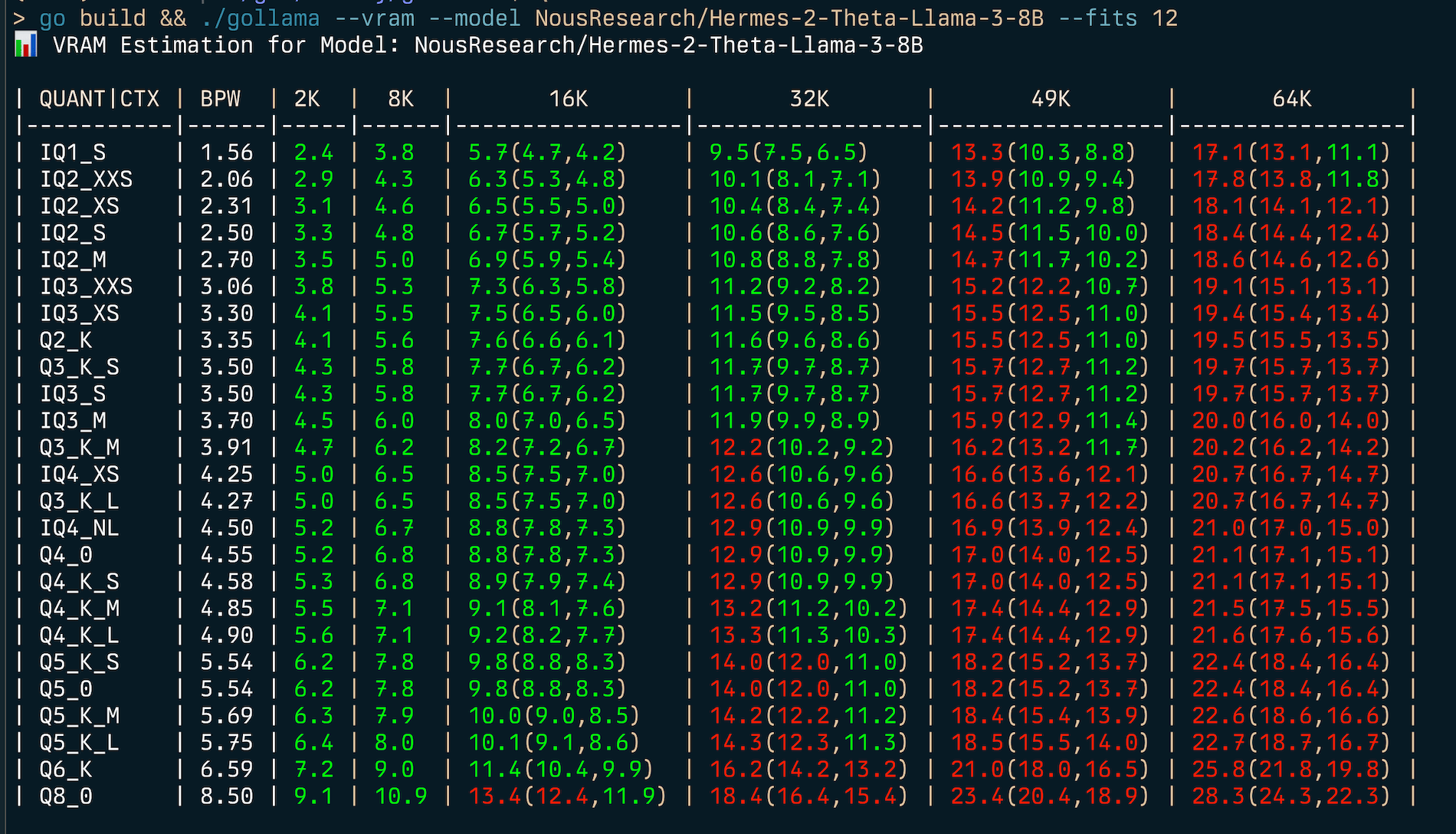 NousResearch/Hermes-2-Theta-Llama-3-8B) --fits: 可用内存(GB)用于上下文计算(如6表示 6GB)--vram-to-nth或--context: 最大上下文长度(如32k或128k)--quant: 覆盖量化级别(如Q4_0、Q5_K_M)