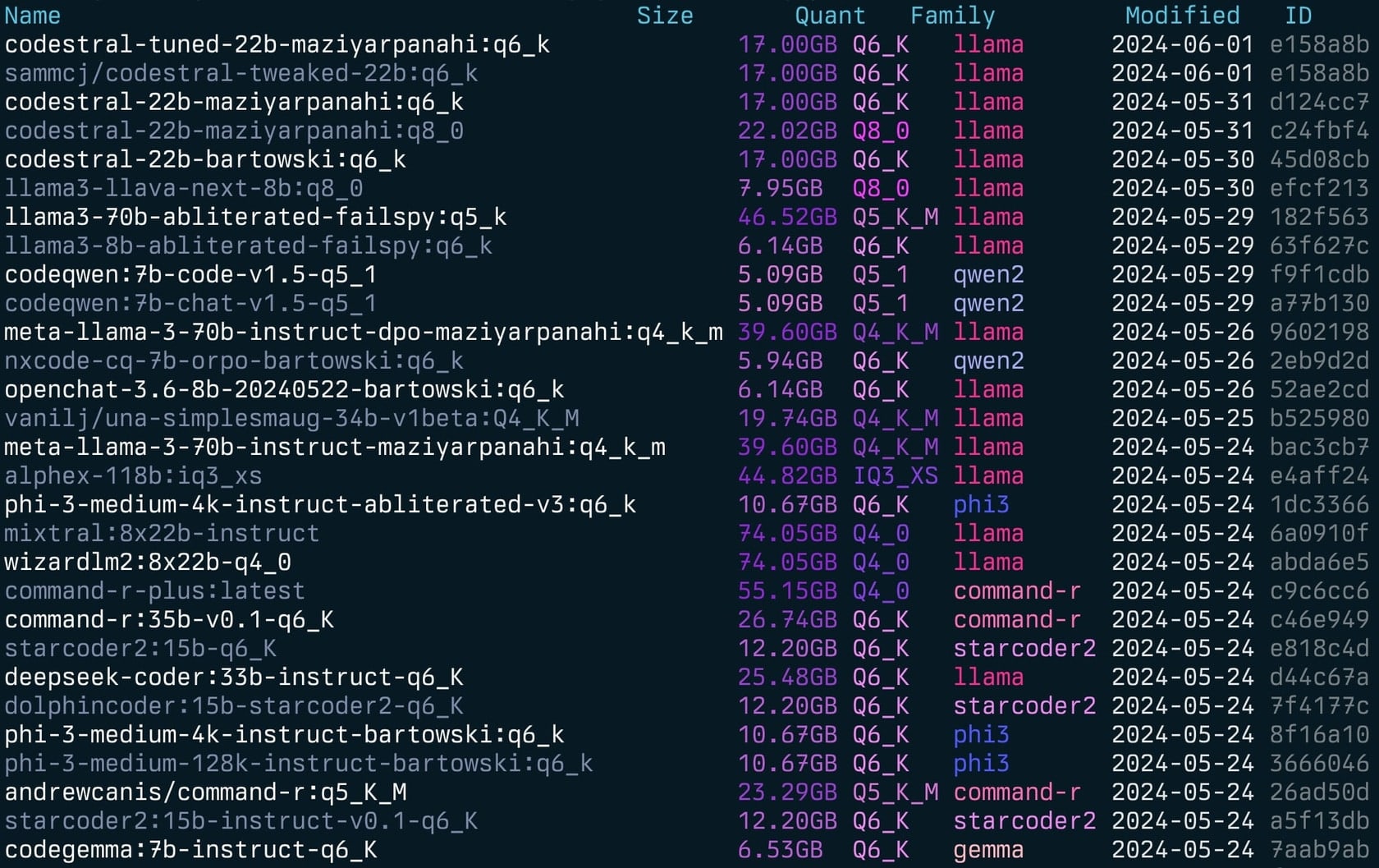 一位本地 AI 开发者在 macOS 上长期运行 Ollama 进行模型实验,随着测试迭代,本地积累了数十个不同版本和量化等级的模型文件。