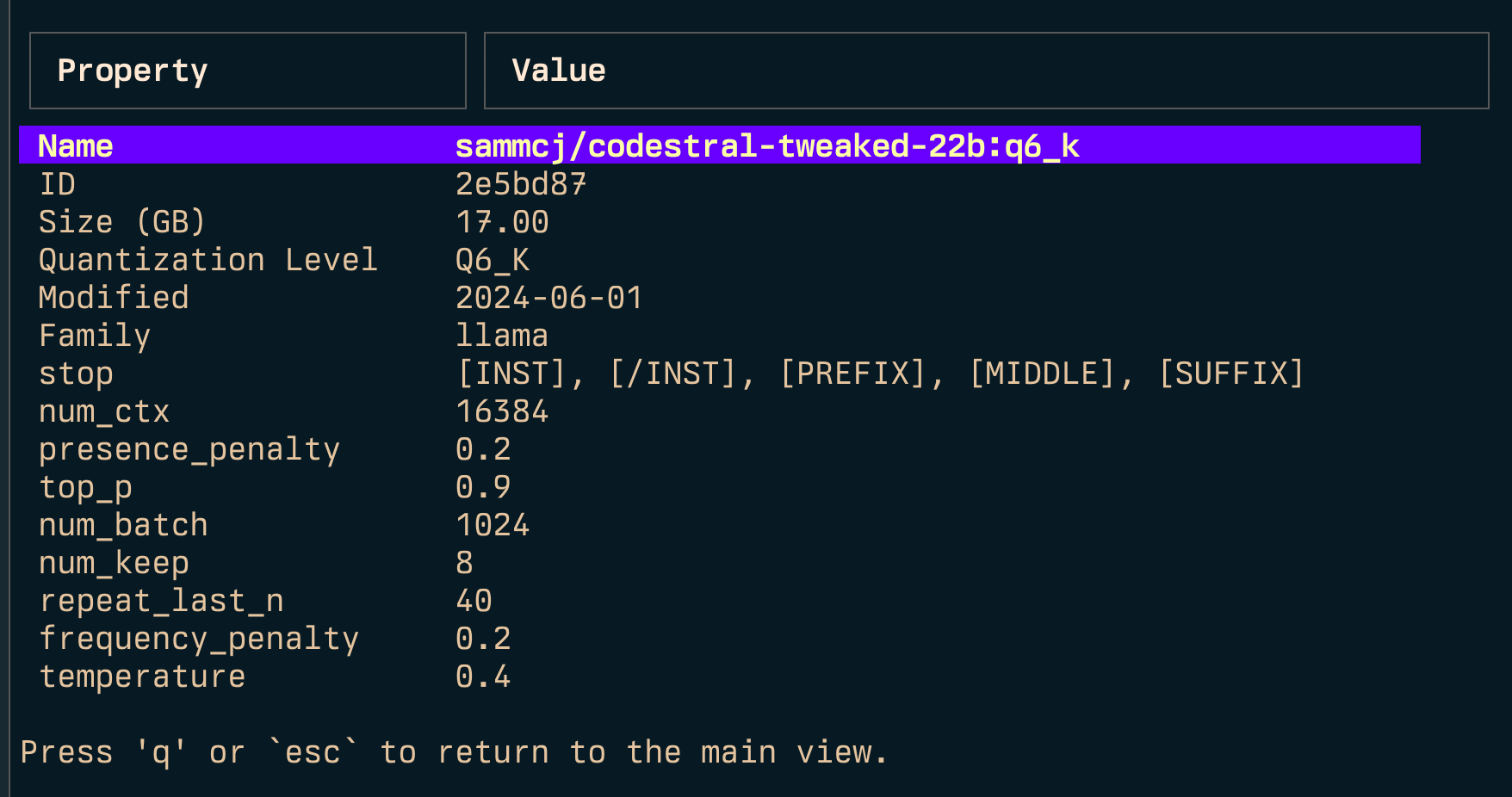 Space: 选择Enter: 运行模型(Ollama run)i: 检查模型t: Top(显示正在运行的模型)D: 删除模型e: 编辑模型c: 复制模型U: 卸载所有模型p: 拉取现有模型ctrl+k: 拉取模型并保留用户配置ctrl+p: 拉取新模型P: 推送模型n: 按名称排序s: 按大小排序m: 按修改日期排序k: 按量化级别排序f: 按家族排序B: 按参数量排序r: 重命名模型 (正在进行中)q: 退出
