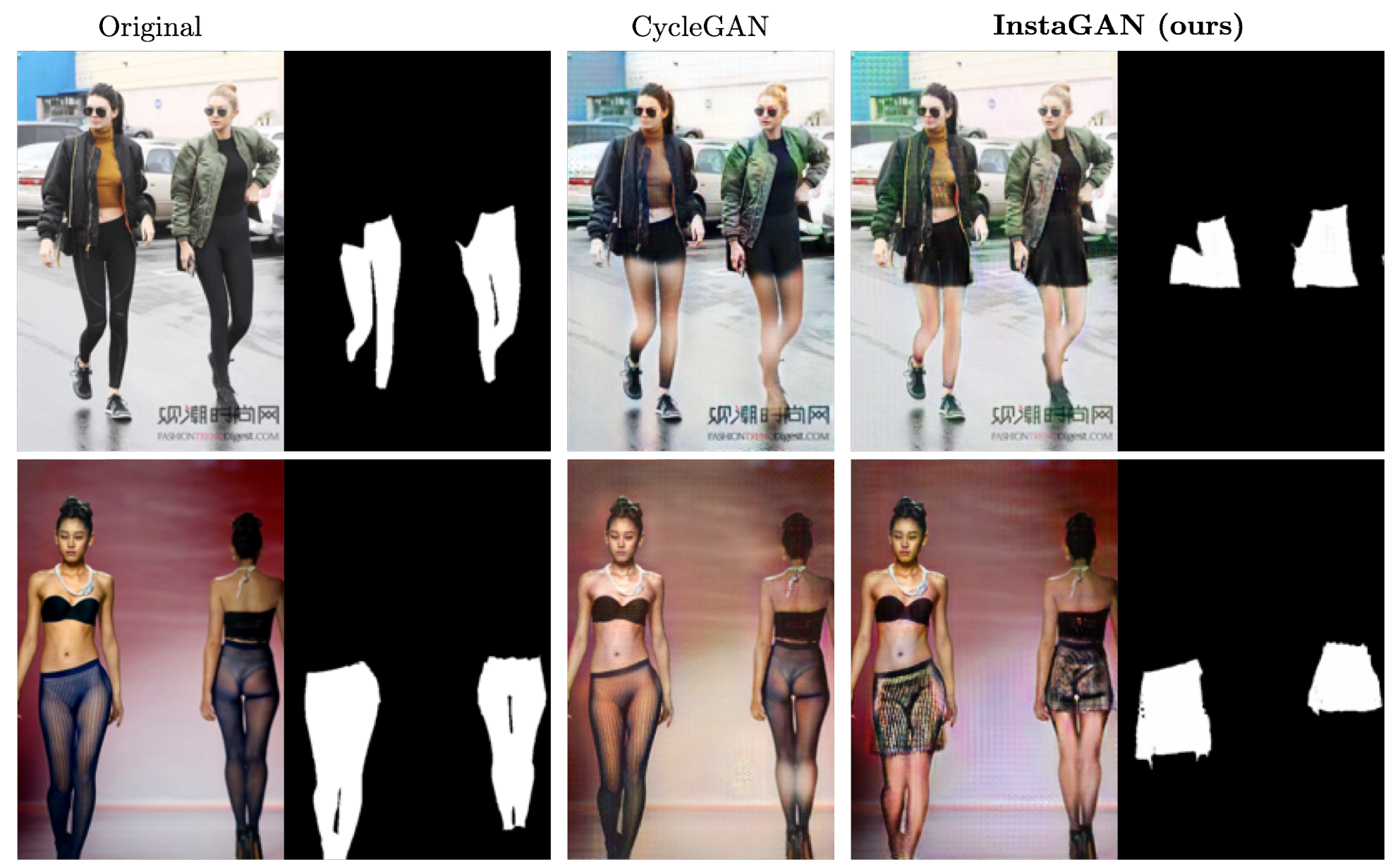 - 支持多实例并发:即使单张照片中有多位模特穿着牛仔裤,instagan 也能逐一识别并独立转换为短裙,互不干扰且逻辑清晰。