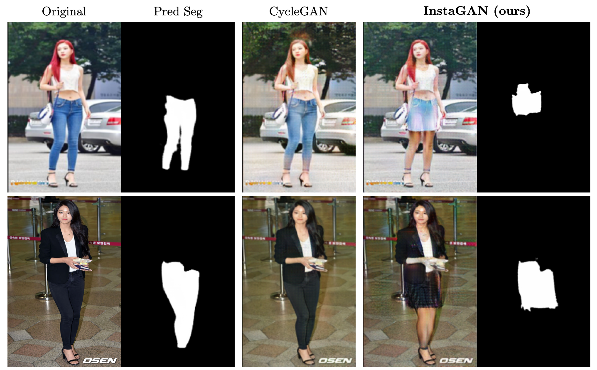 - 精准实例定位:instagan 利用分割掩码(Mask)精准锁定每一条牛仔裤实例,仅对目标区域进行风格迁移,完美保持背景和人物其他部位不变。