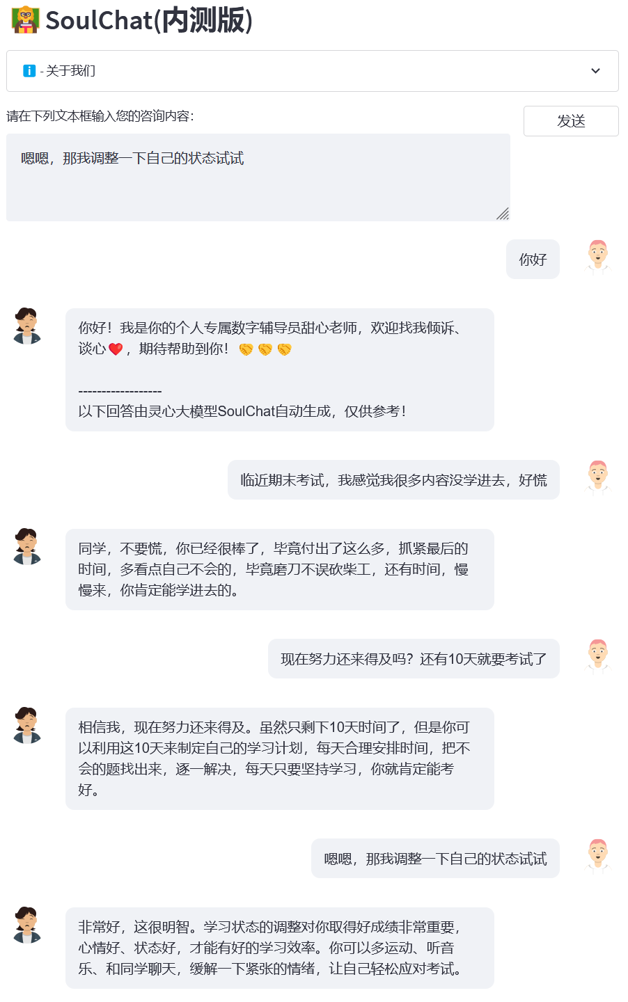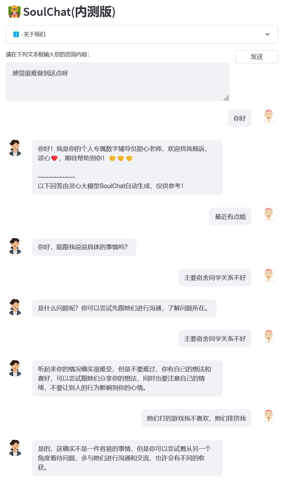 - 具备深度共情:SoulChat 基于百万级多轮共情对话微调,能精准识别学生情绪并输出“我理解你的感受”、“这确实很不容易”等温暖回应,建立信任连接。
