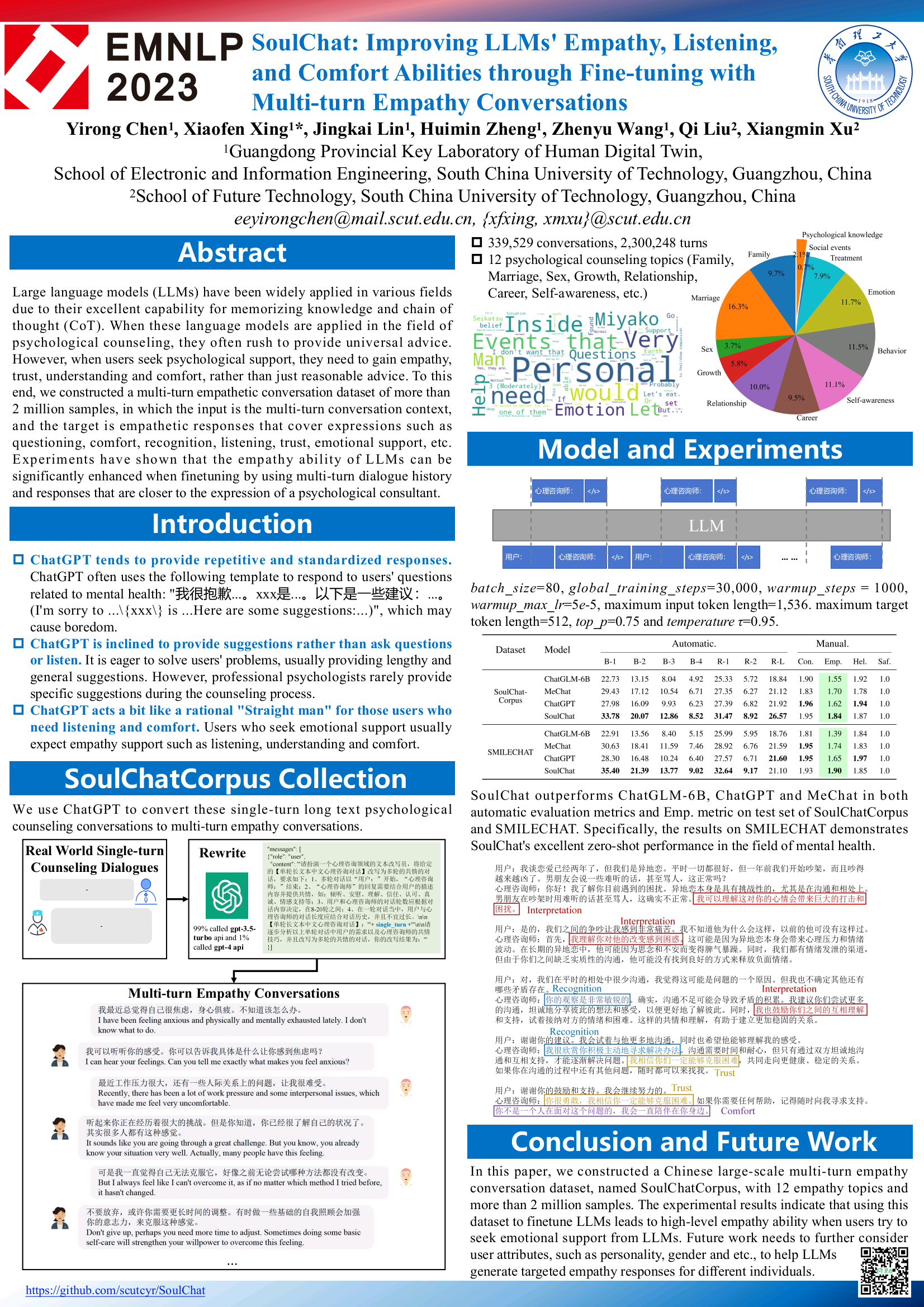 - 👏🏻 2023.12.07:我们的论文,收录在Findings of EMNLP 2023,详见SoulChat: Improving LLMs’ Empathy, Listening, and Comfort Abilities through Fine-tuning with Multi-turn Empathy Conversations