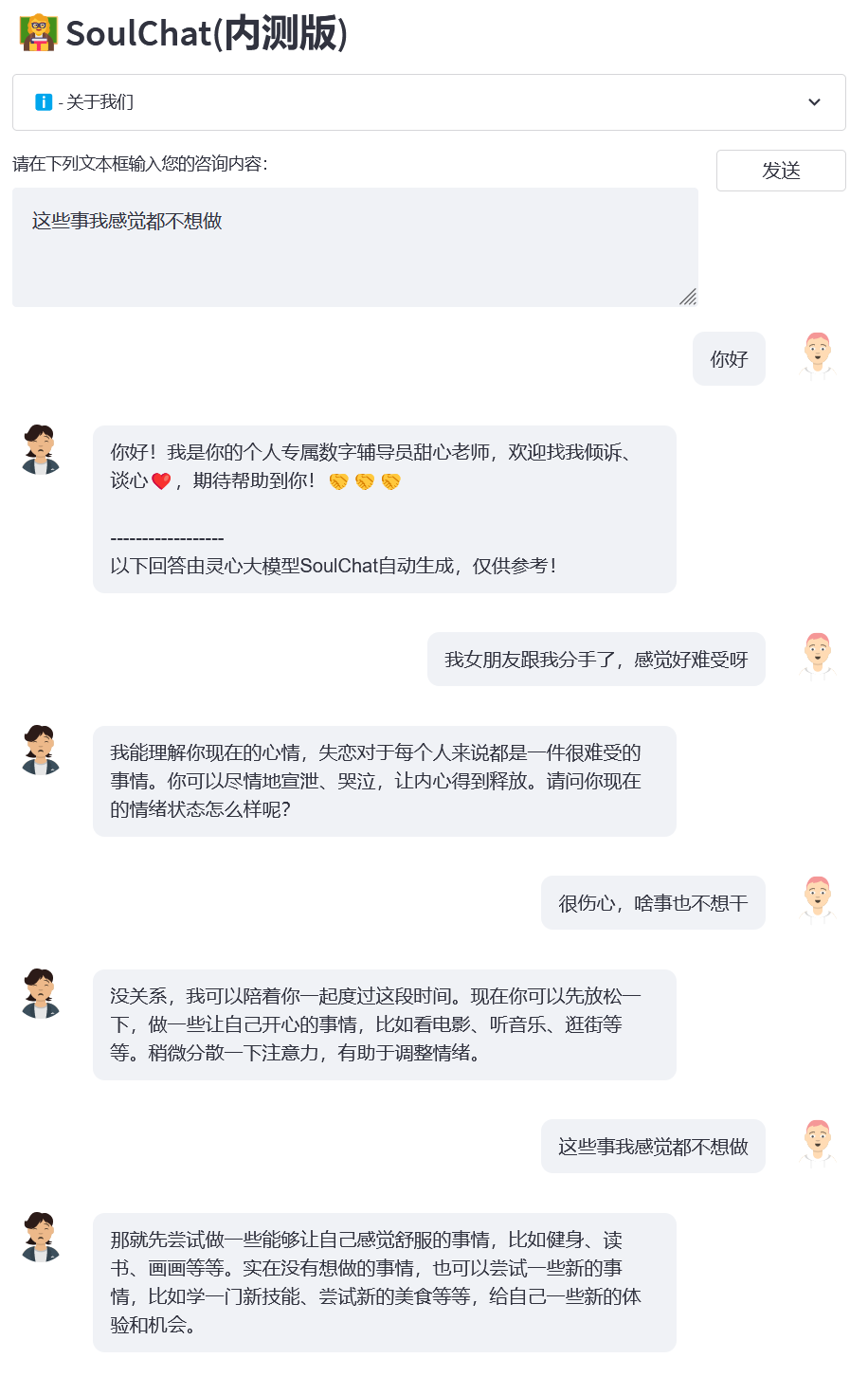 - 长文本精准交互:依托专为中文长文本咨询构建的数据集,SoulChat 能完整理解复杂的背景叙述,并在多轮对话中保持上下文连贯与情感一致。