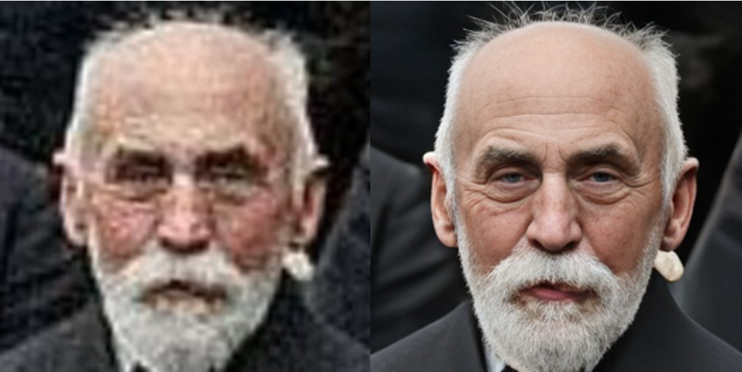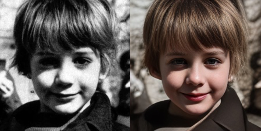 - 黑白照片上色依赖人工调色,肤色与光影关系不自然,看起来像假人。