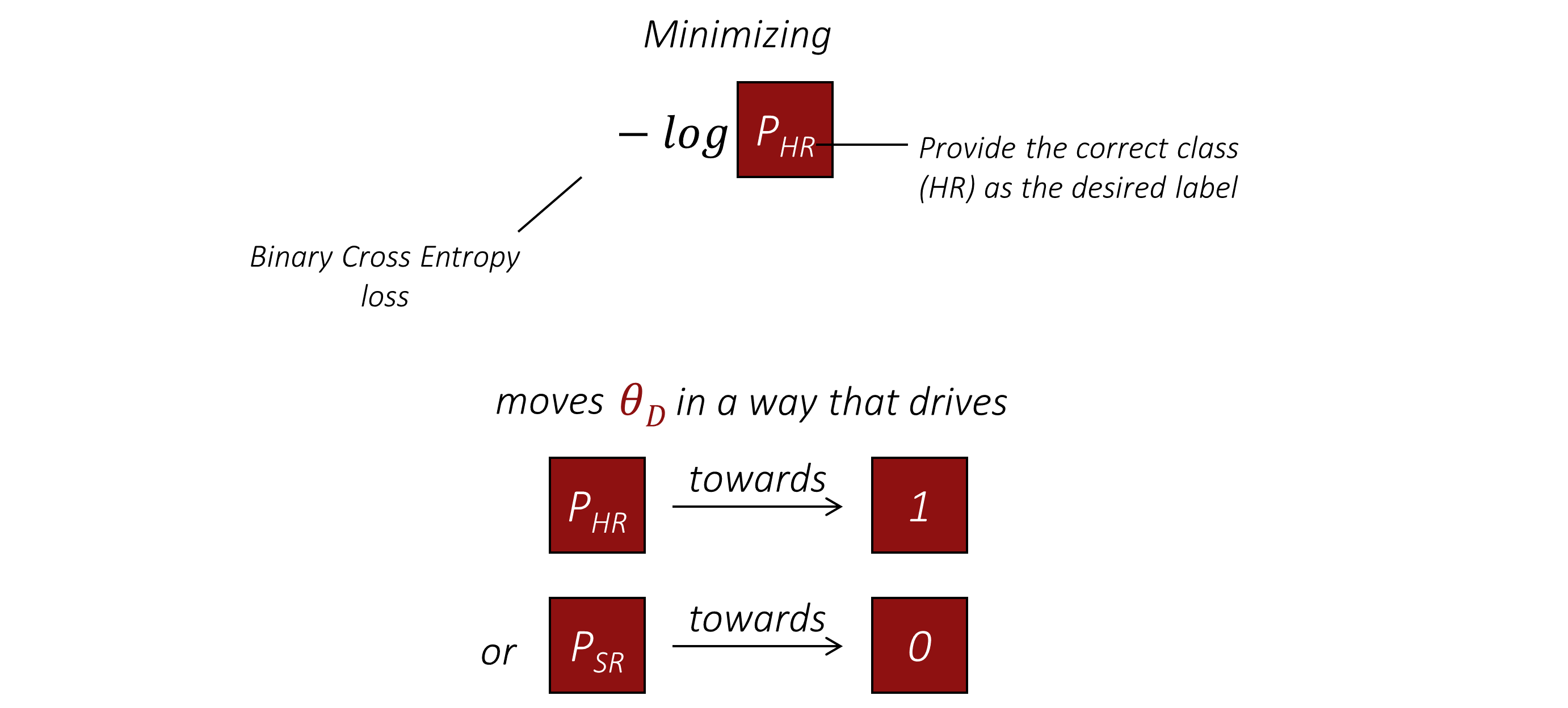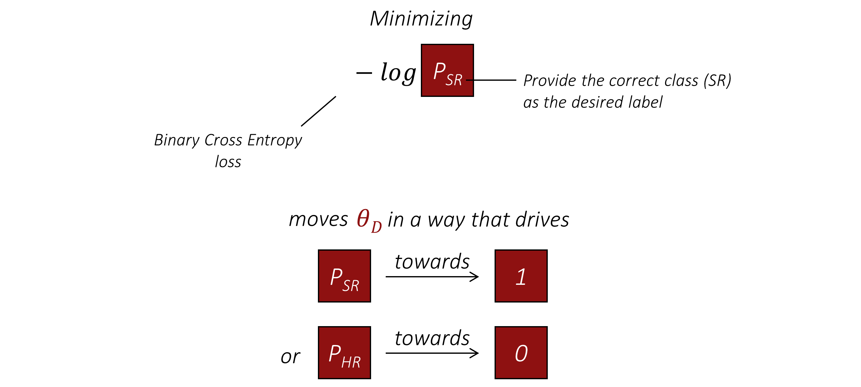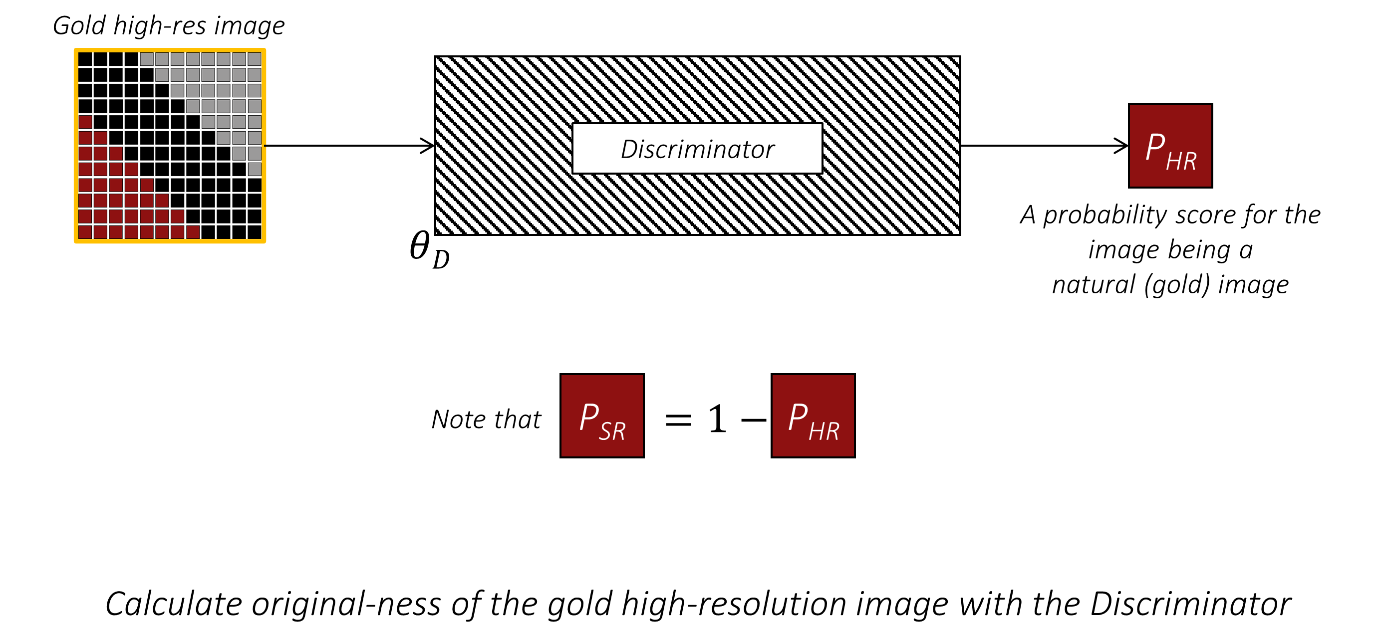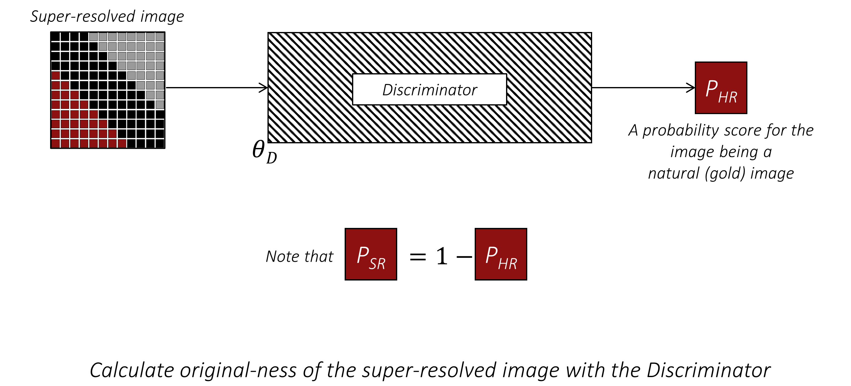 在训练判别器时,我们同样将超分辨率图像输入判别器,但这次会使用判别器的输出来计算与正确且期望的 $SR$ 标签之间的二元交叉熵损失。